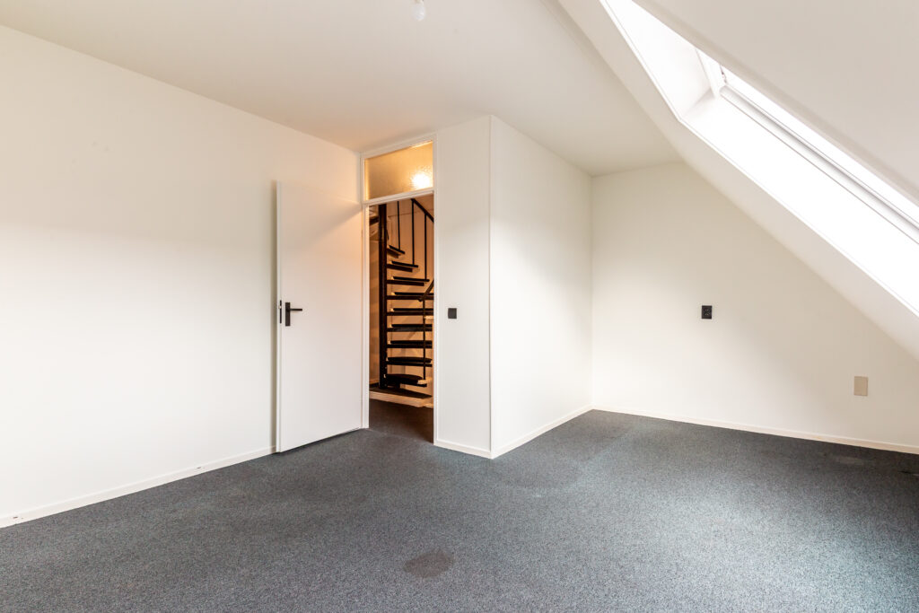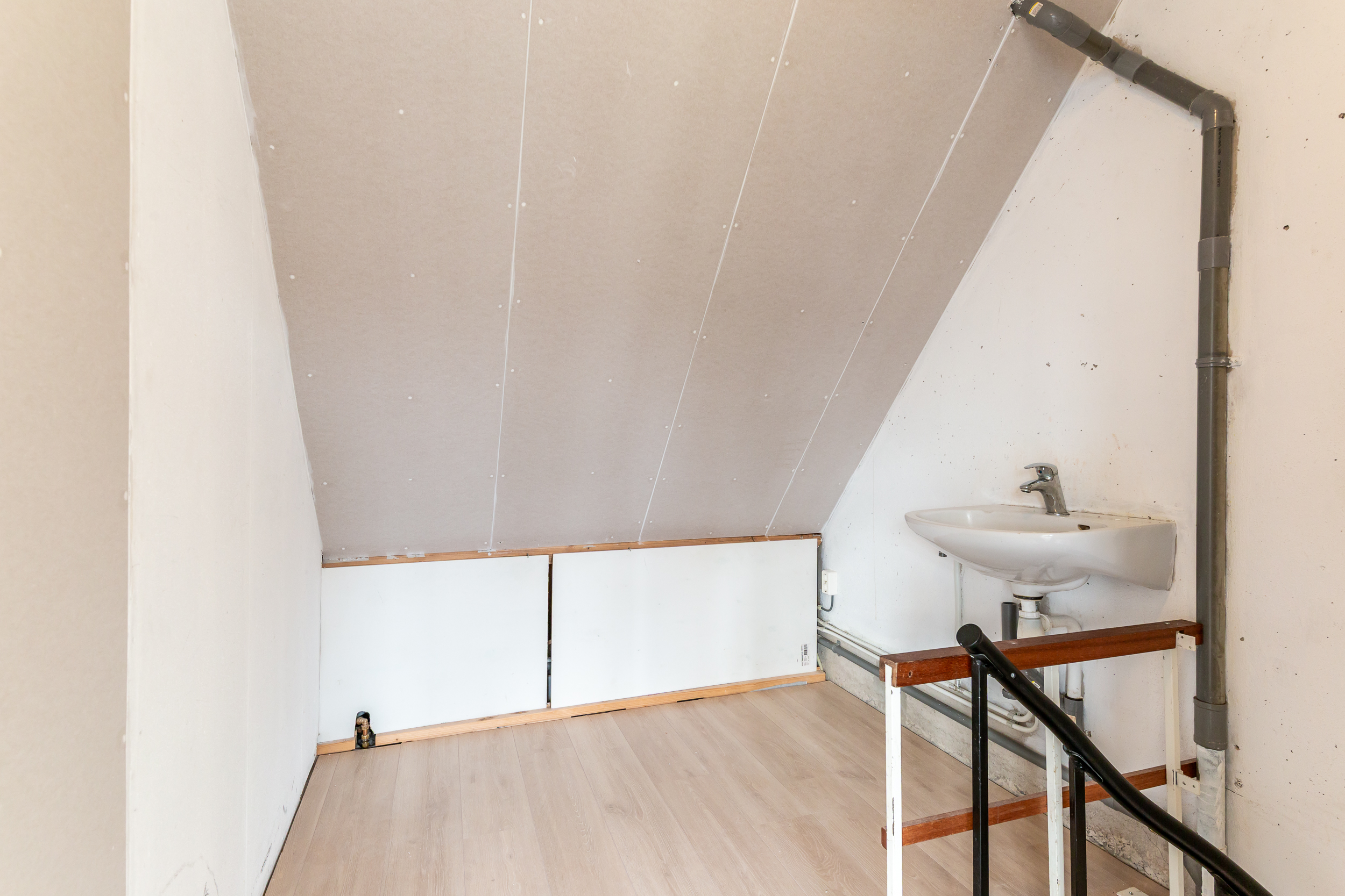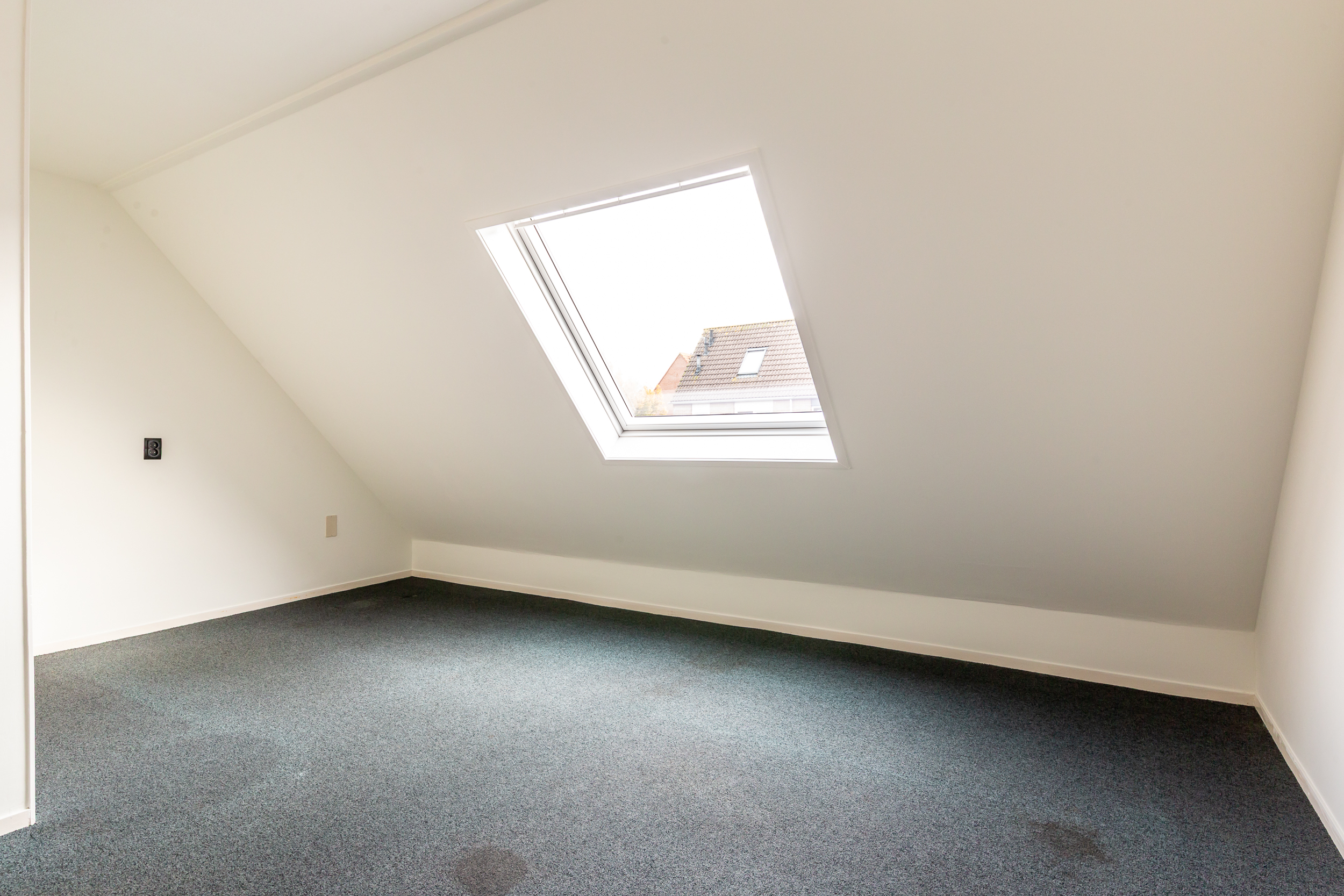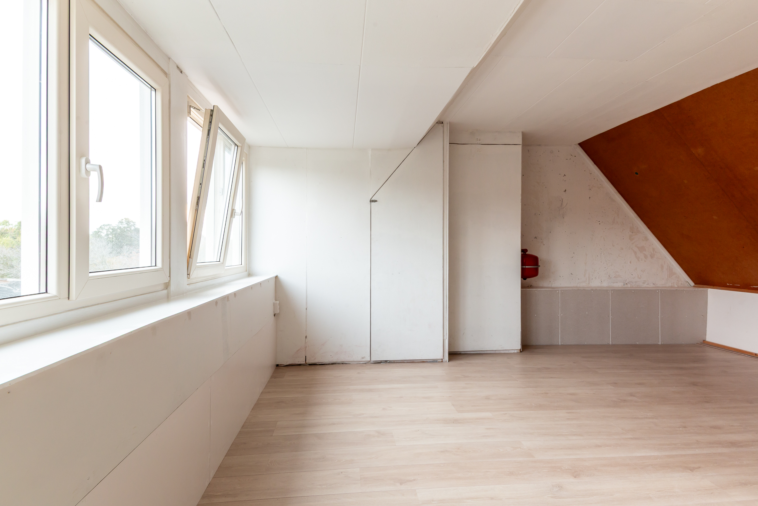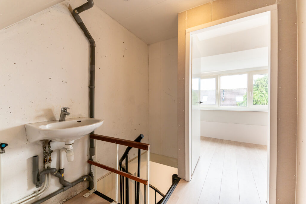 Via spiltrap te bereiken verdieping. Overloop met een wastafel en de wasmachineaansluiting. Toegang tot de ruime 3e slaapkamer (ca. 15 m2) met kunststof dakkapel. Technische ruimte met de opstelplaats van de cv-ketel en de heteluchtverwarming. De verdieping is voorzien van een fraaie laminaatvloer (2025).