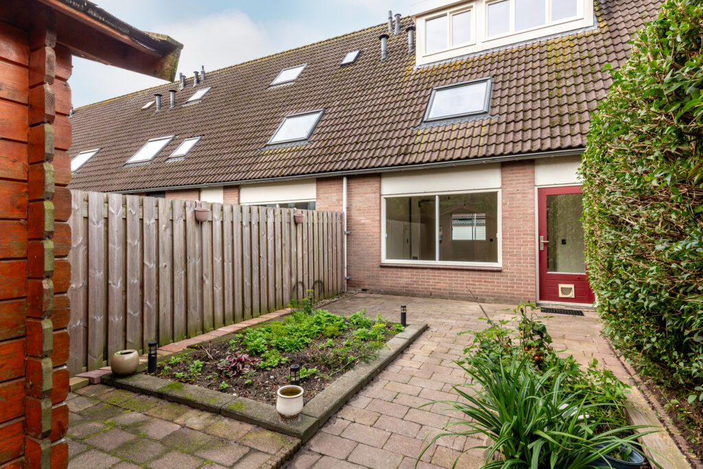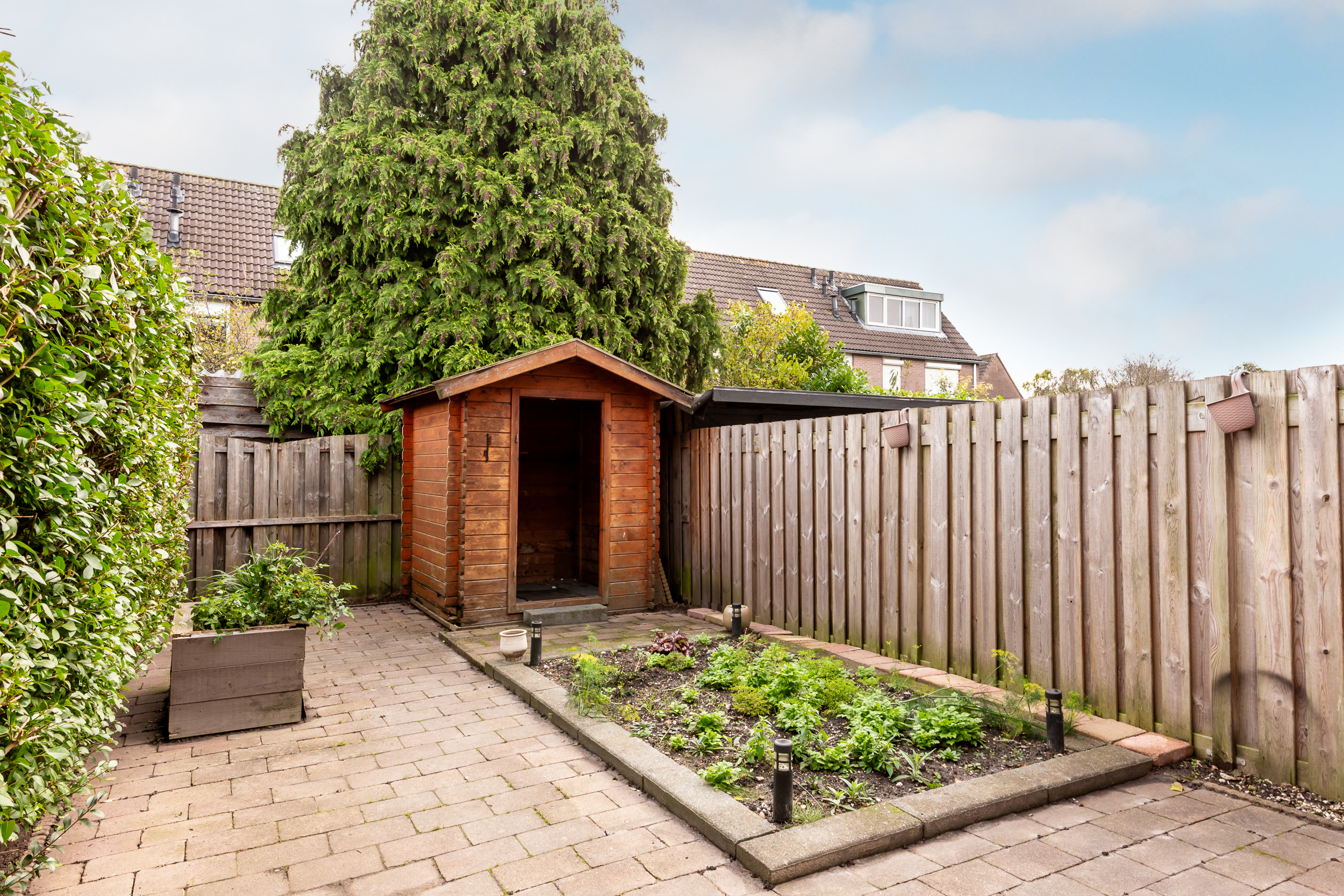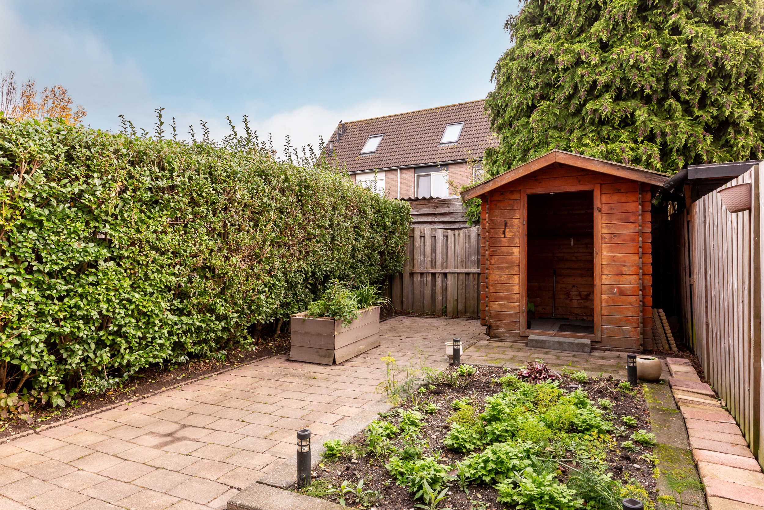De verzorgd aangelegde tuin is gelegen op het oosten en voorzien van een groot terras met bestrating, borders met bomen en beplanting, een houten tuinhuis en wordt omheind middels schuttingen. De tuin is onderhoudsarm aangelegd, geeft veel privacy en biedt de mogelijkheid om een praktische achterom te realiseren.