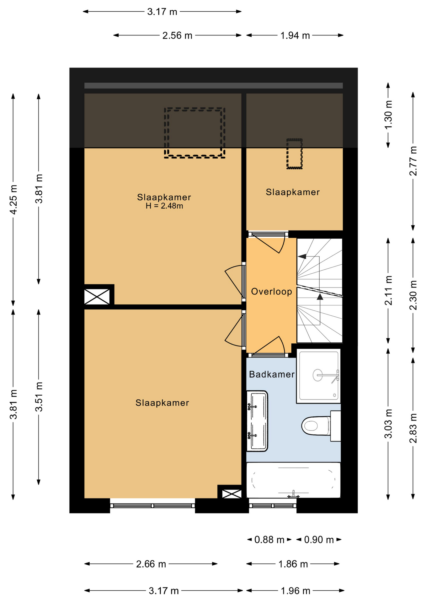 Overloop met toegang tot 3 ruime slaapkamers, waarbij 1 slaapkamer momenteel in gebruik is als kastenkamer. Moderne badkamer (2013) met een ligbad, douche, 2e toilet, wastafelmeubel met dubbele wastafel en een raam voor de natuurlijke ventilatie. De verdieping is voorzien van een laminaatvloer.