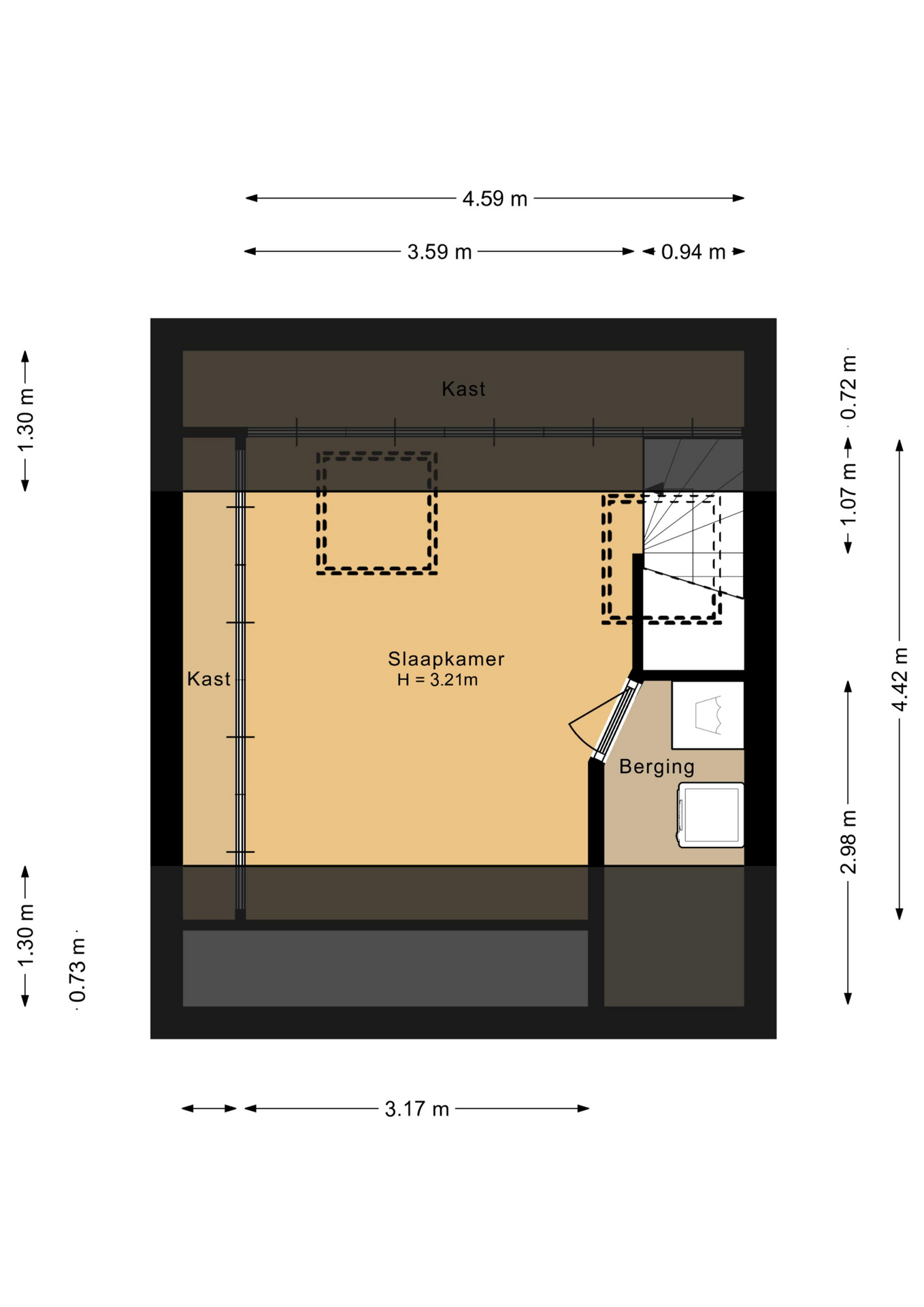 Via vaste trap te bereiken verdieping met een ruime 4e slaapkamer, welke voorzien is van 2 dakramen (2013). Technische ruimte met de opstelling van de cv-ketel en de heteluchtverwarming en een waskamer met de wasmachine/droger aansluiting, omvormer voor de 8 zonnepanelen en veel praktische bergruimte. De verdieping is voorzien van een linoleum vloer.