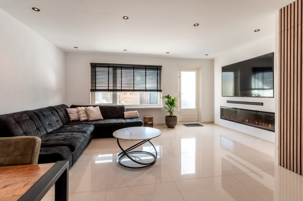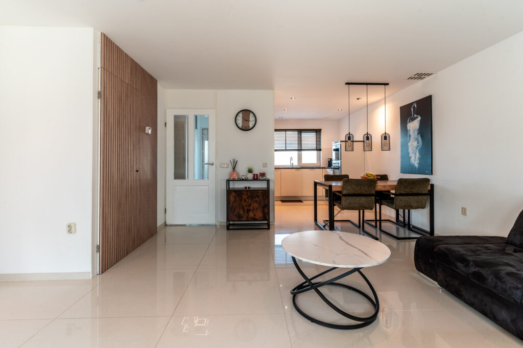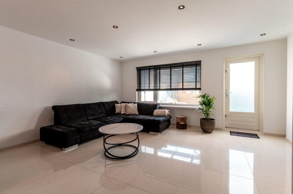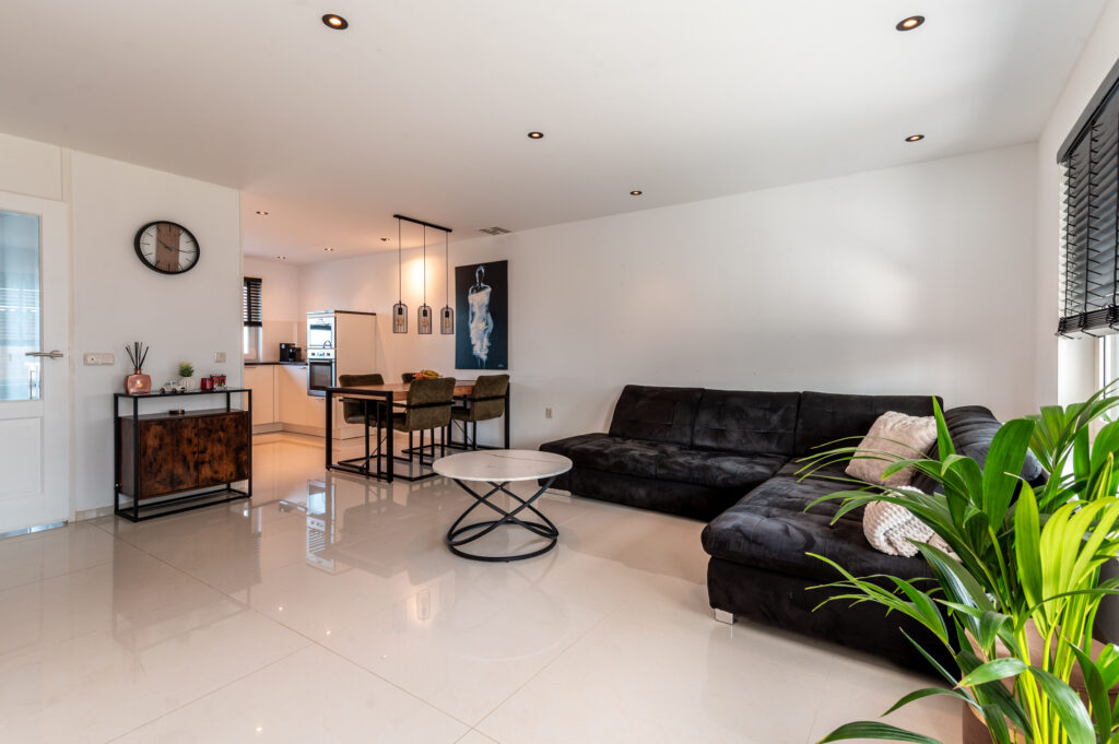Entree/hal met de toiletruimte, meterkast, garderobe, trapopgang naar de verdieping en toegang naar de woonkamer. Ruime tuingerichte woonkamer (5.17 m. breed) met grote raampartijen, een trapkast omkleed met houten panelen, luxe cinema wall met een elektrische sfeerhaard en een deur naar de aangebouwde serre. De serre (2022) is een heerlijke toevoeging aan het huis en is voorzien van een tegelvloer en een glazen schuifwand. Hier kunt u heerlijk vertoeven op elk gewenst moment van de dag! Aan de voorzijde bevindt zich de fraaie inbouwkeuken in U-opstelling, welke voorzien is van de volgende apparatuur; koelkast, vriezer, vaatwasser, oven, magnetron, 5-pits gaskookplaat (met wokbrander) en een afzuigkap. Ruime opstelmogelijkheden voor een grote eettafel waar u heerlijk met uw familie kunt dineren. De begane grond is voorzien van een verlaagd plafond met ingebouwde spots en een moderne tegelvloer met vloerverwarming.