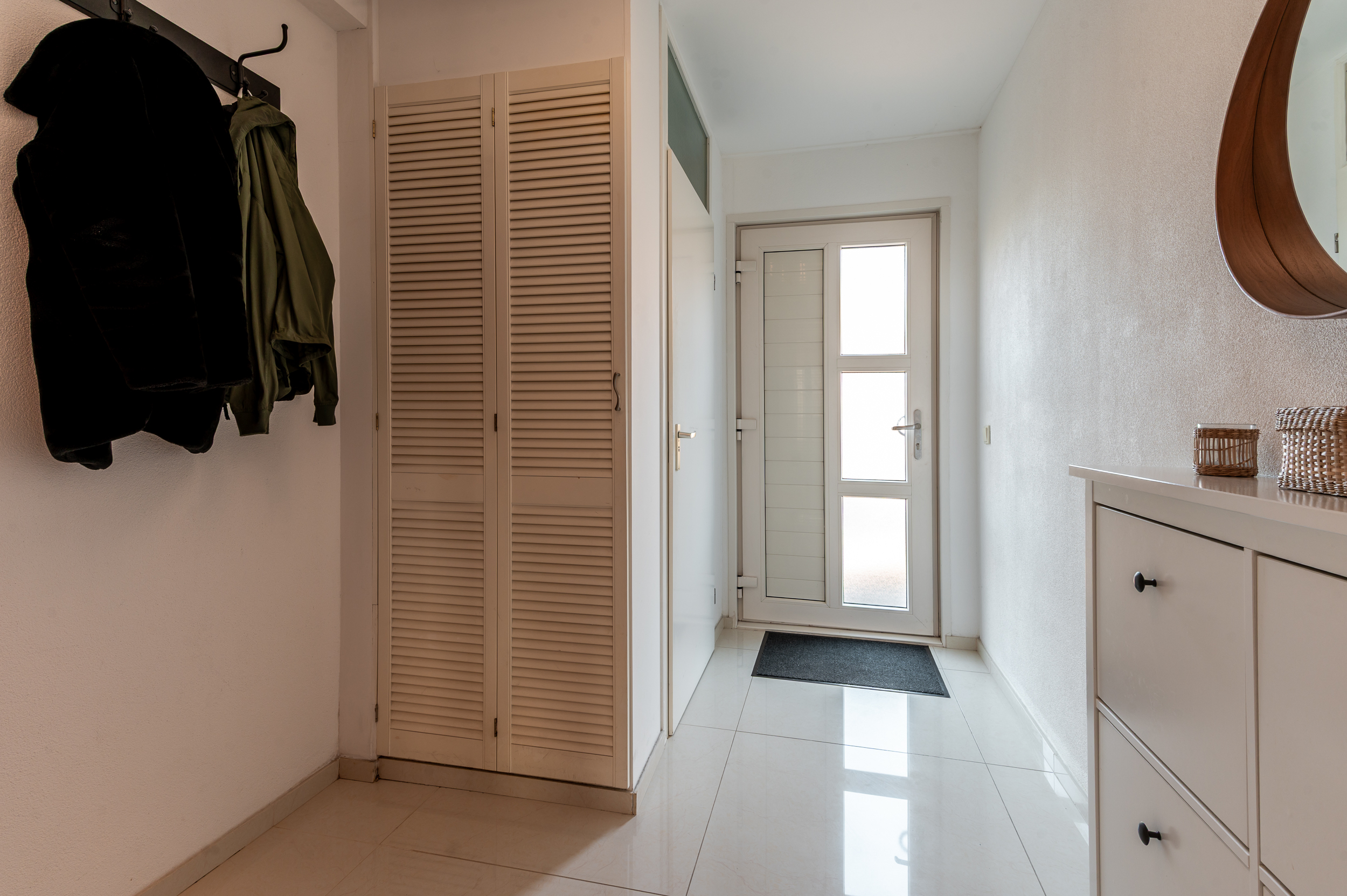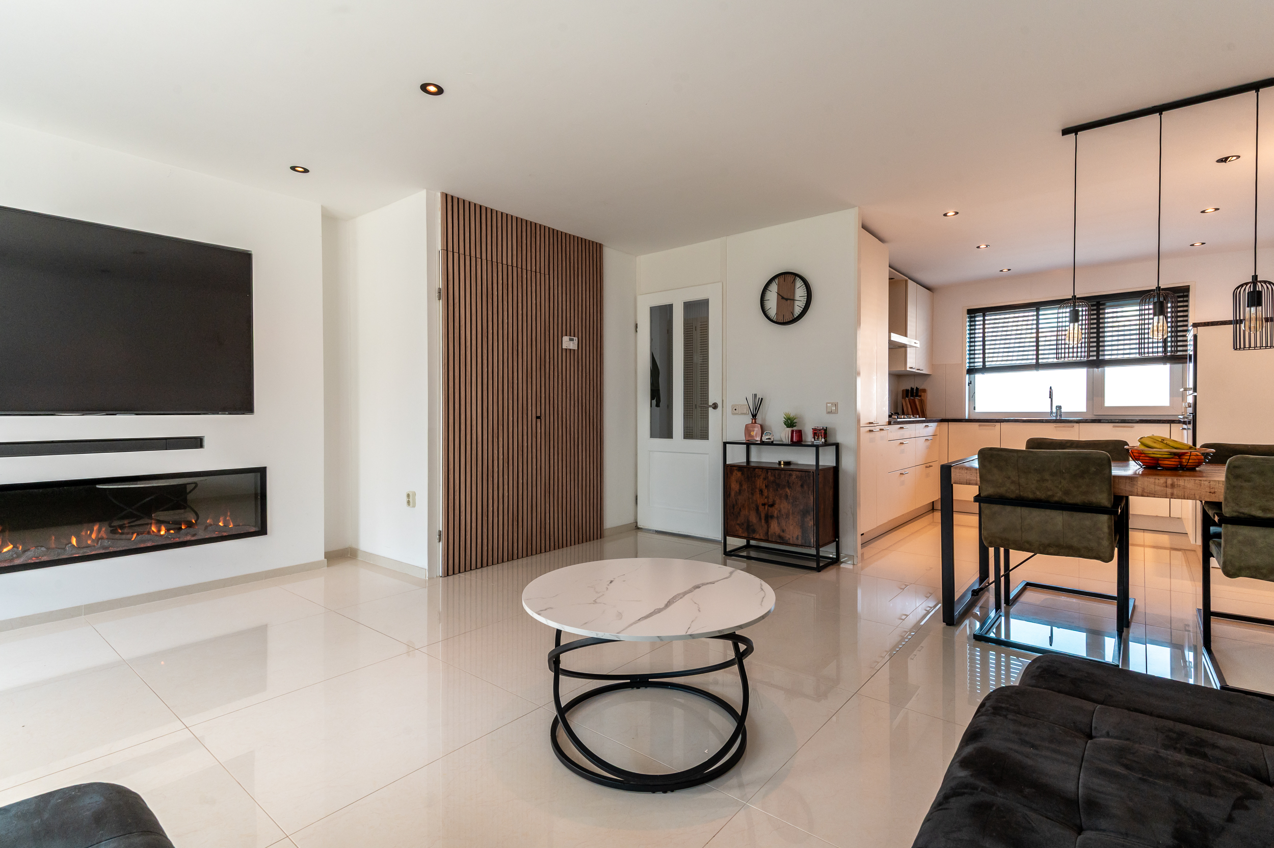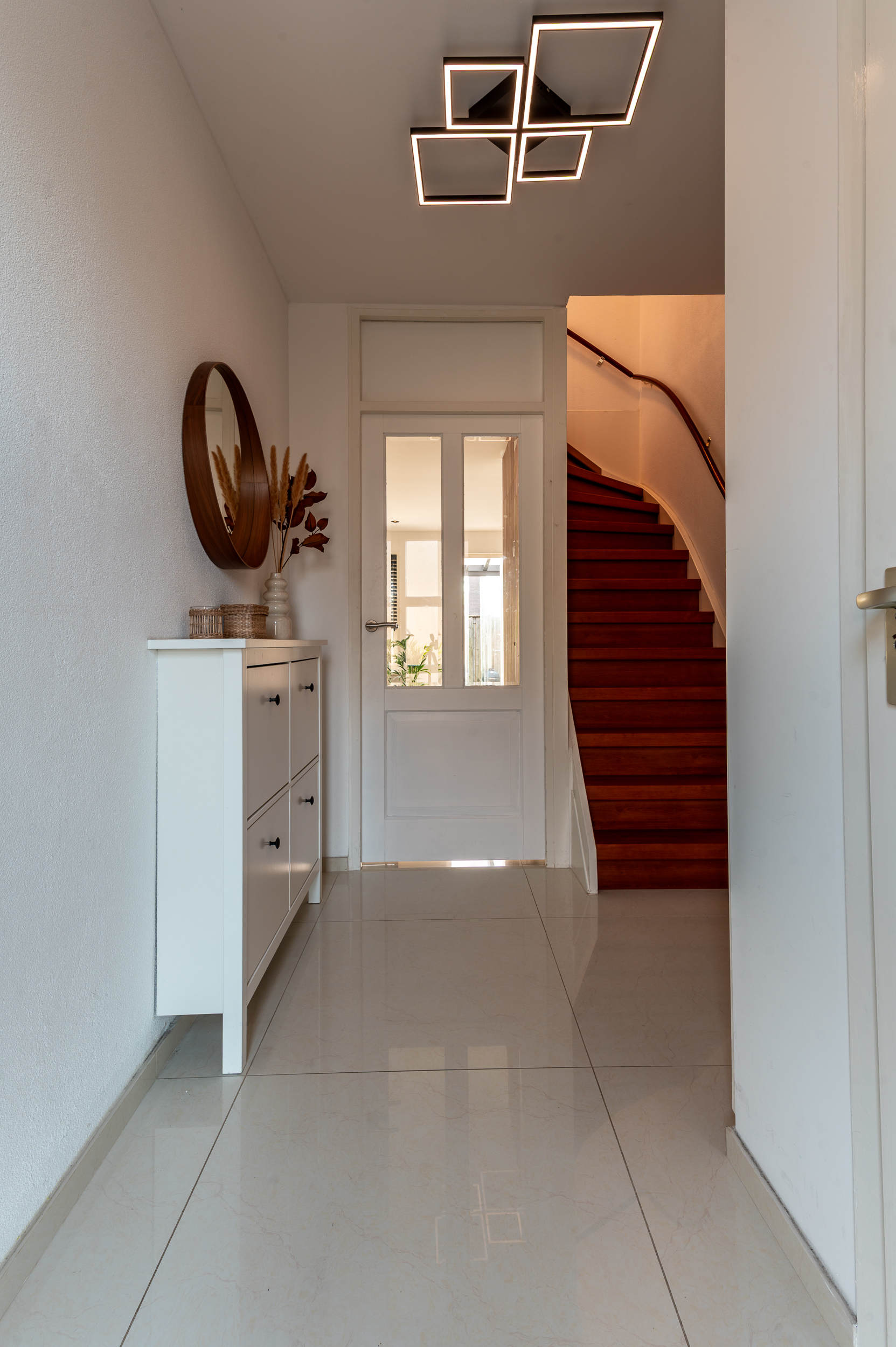 Entree/hal met de toiletruimte, meterkast, garderobe, trapopgang naar de verdieping en toegang naar de woonkamer. Ruime tuingerichte woonkamer (5.17 m. breed) met grote raampartijen, een trapkast omkleed met houten panelen, luxe cinema wall met een elektrische sfeerhaard en een deur naar de aangebouwde serre. De serre (2022) is een heerlijke toevoeging aan het huis en is voorzien van een tegelvloer en een glazen schuifwand. Hier kunt u heerlijk vertoeven op elk gewenst moment van de dag! Aan de voorzijde bevindt zich de fraaie inbouwkeuken in U-opstelling, welke voorzien is van de volgende apparatuur; koelkast, vriezer, vaatwasser, oven, magnetron, 5-pits gaskookplaat (met wokbrander) en een afzuigkap. Ruime opstelmogelijkheden voor een grote eettafel waar u heerlijk met uw familie kunt dineren. De begane grond is voorzien van een verlaagd plafond met ingebouwde spots en een moderne tegelvloer met vloerverwarming.