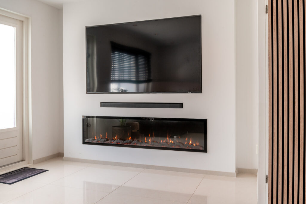 * Tuingerichte woonkamer met grote raampartijen, een luxe cinema wall en een aangebouwde serre