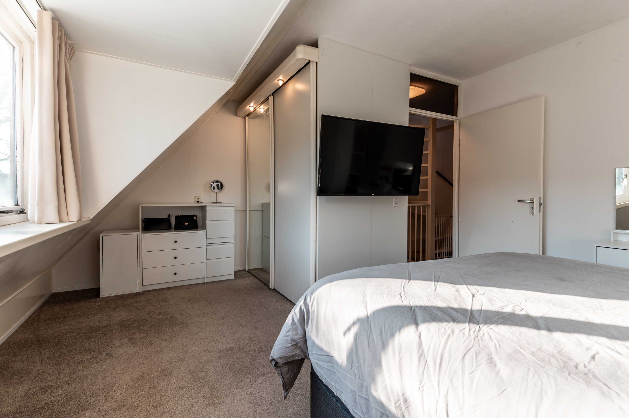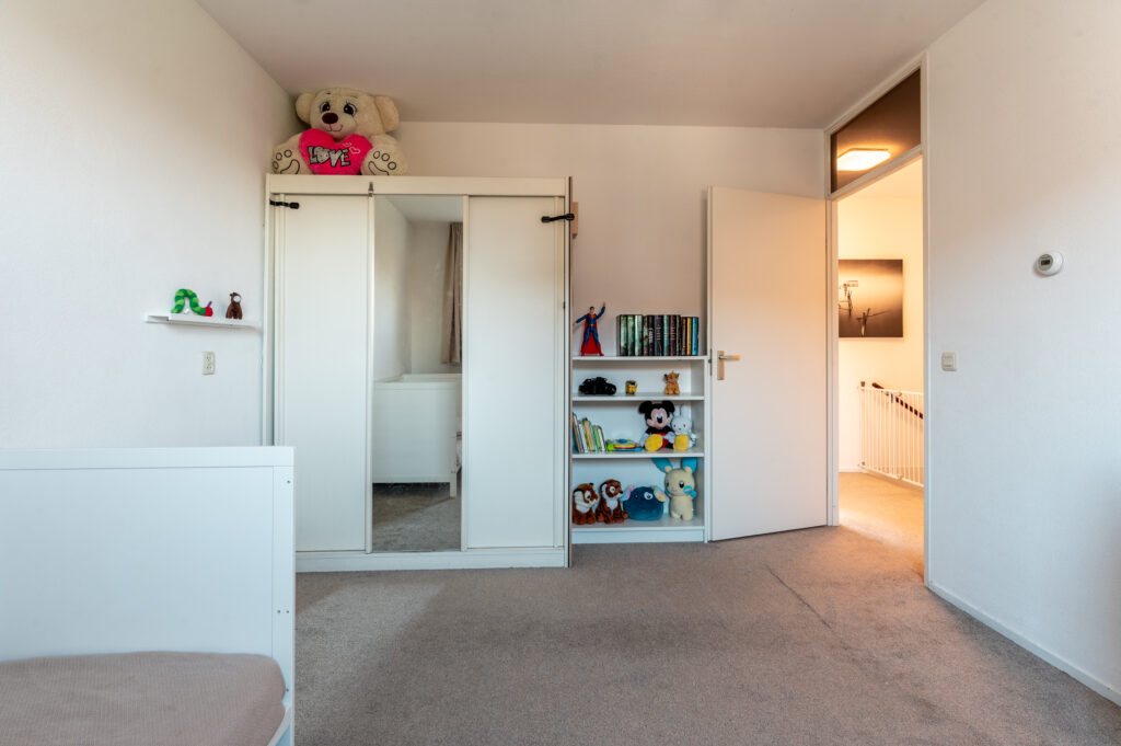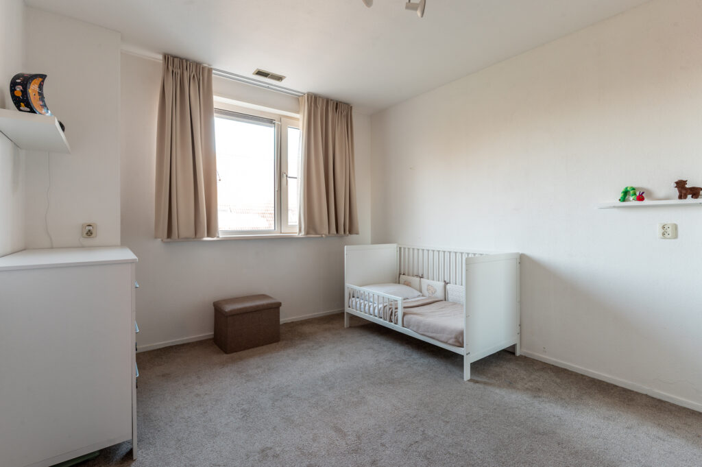 Overloop met toegang tot 2 ruime slaapkamers (ca. 14 en 12 m2), waarbij de ouderslaapkamer over de volle breedte van de woning en profiteert van een dakkapel. Moderne, geheel betegelde badkamer met een douche, 2e toilet, wastafelmeubel en een raam voor de natuurlijke ventilatie. De verdieping is voorzien van vloerbedekking (onder de vloerbedekking ligt een laminaatvloer).