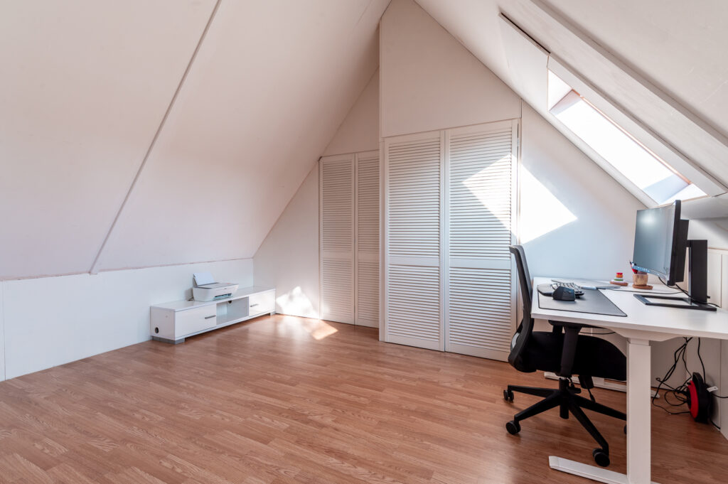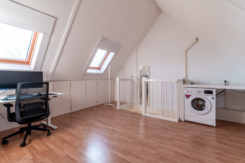 Via vaste trap te bereiken verdieping (ca. 18 m2) met 2 dakramen en de wasmachine/droger aansluiting. Technische ruimte met de opstelplaats van de cv-ketel en de heteluchtverwarming. Mogelijkheden voor het realiseren van een ruime 3e slaapkamer. De verdieping is voorzien van een laminaatvloer.