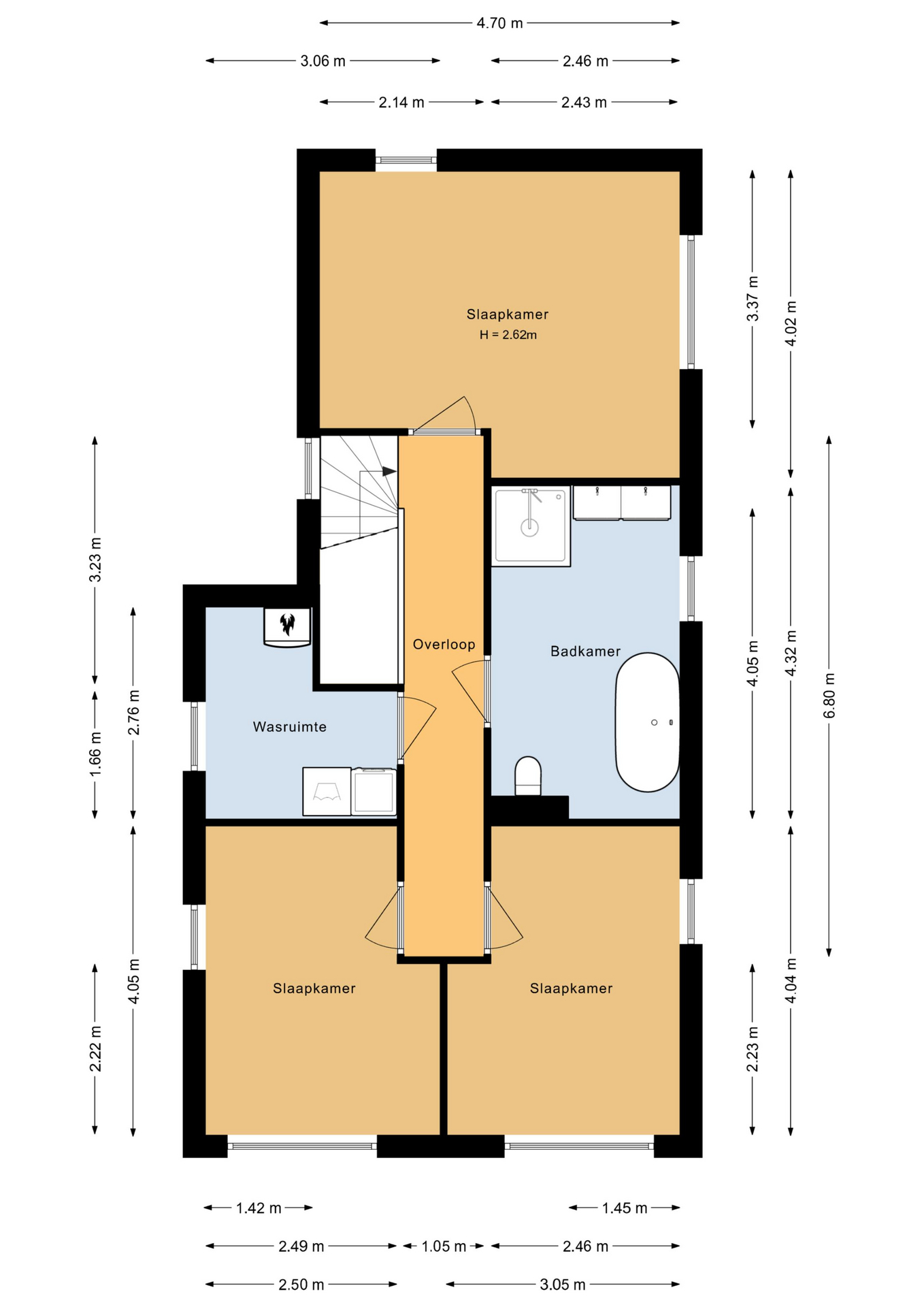 Ruime overloop, slaapkamer 1 (ca. 16 m²), slaapkamer 2 (ca. 10 m²), slaapkamer 3 (ca. 12 m²), aparte ruimte met opstelling wasmachine en droger, omvormer zonnepanelen en boiler, moderne luxe badkamer voorzien van dubbele wastafel met meubel, inloopdouche, ligbad en hangend toilet.