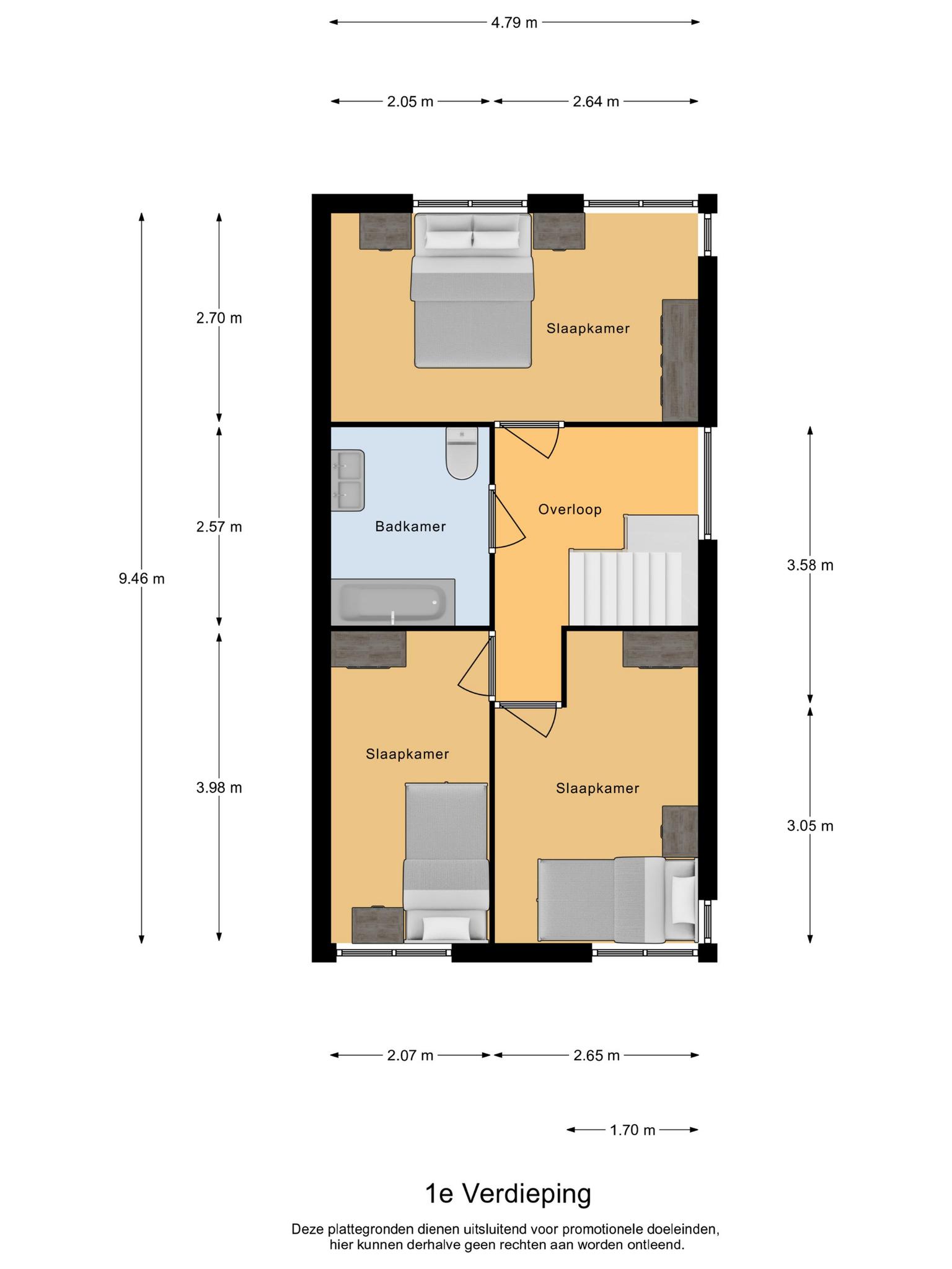 Overloop met toegang tot 3 in grote variërende slaapkamers (ca. 13 / 10 / 8 m2), waarvan de ouderslaapkamer over de volle breedte van de woning. De badkamer (2006) is voorzien van een ligbad, wastafelmeubel met dubbele kraan, 2e toilet, een toiletkast en een designradiator.