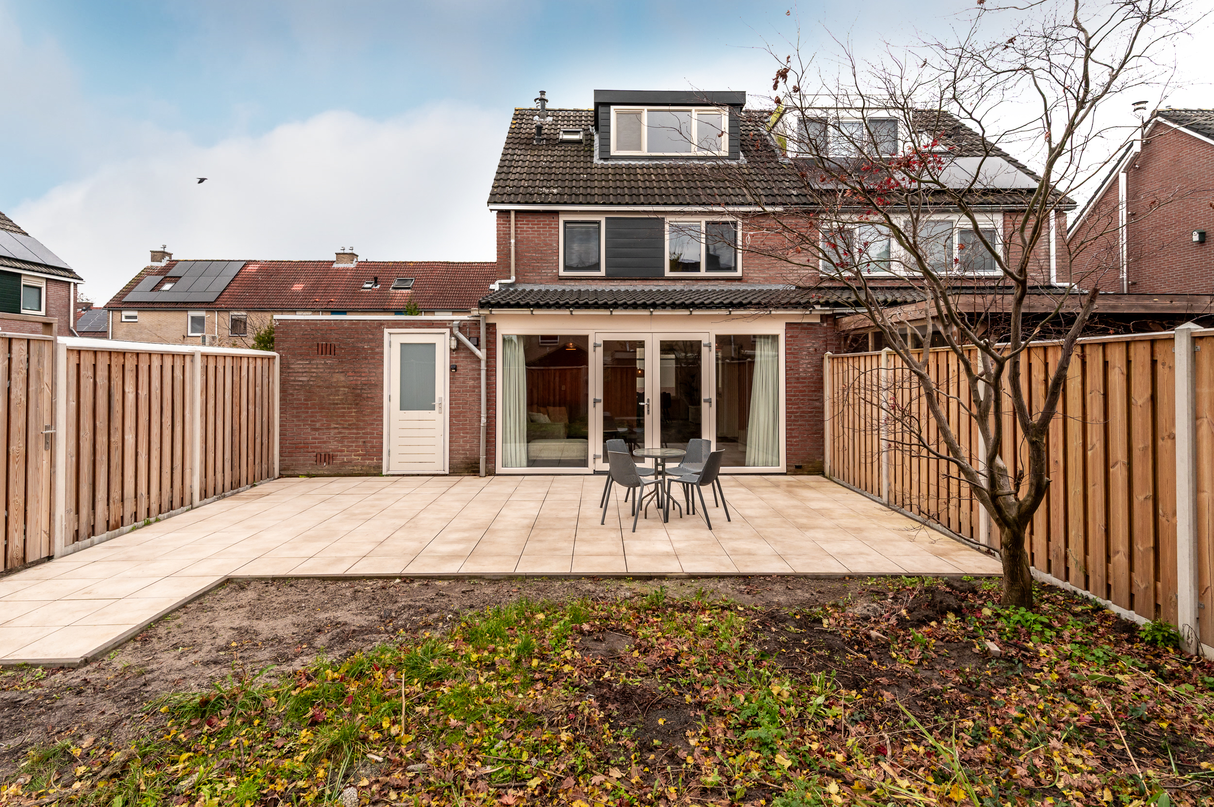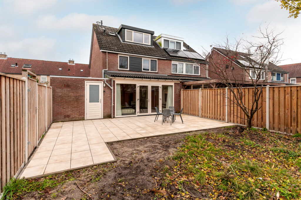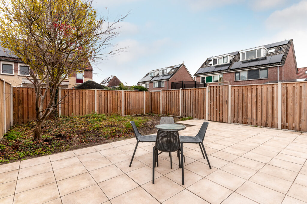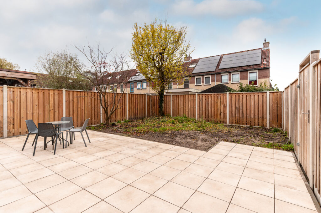 De verzorgd aangelegde achtertuin is gelegen op het westen en is voorzien van een groot terras met keramische tegels, hout/beton schuttingen en een praktische achterom. De basis van de tuin is gelegd en kan naar wens van de volgende bewoner naar eigen smaak worden afgewerkt.