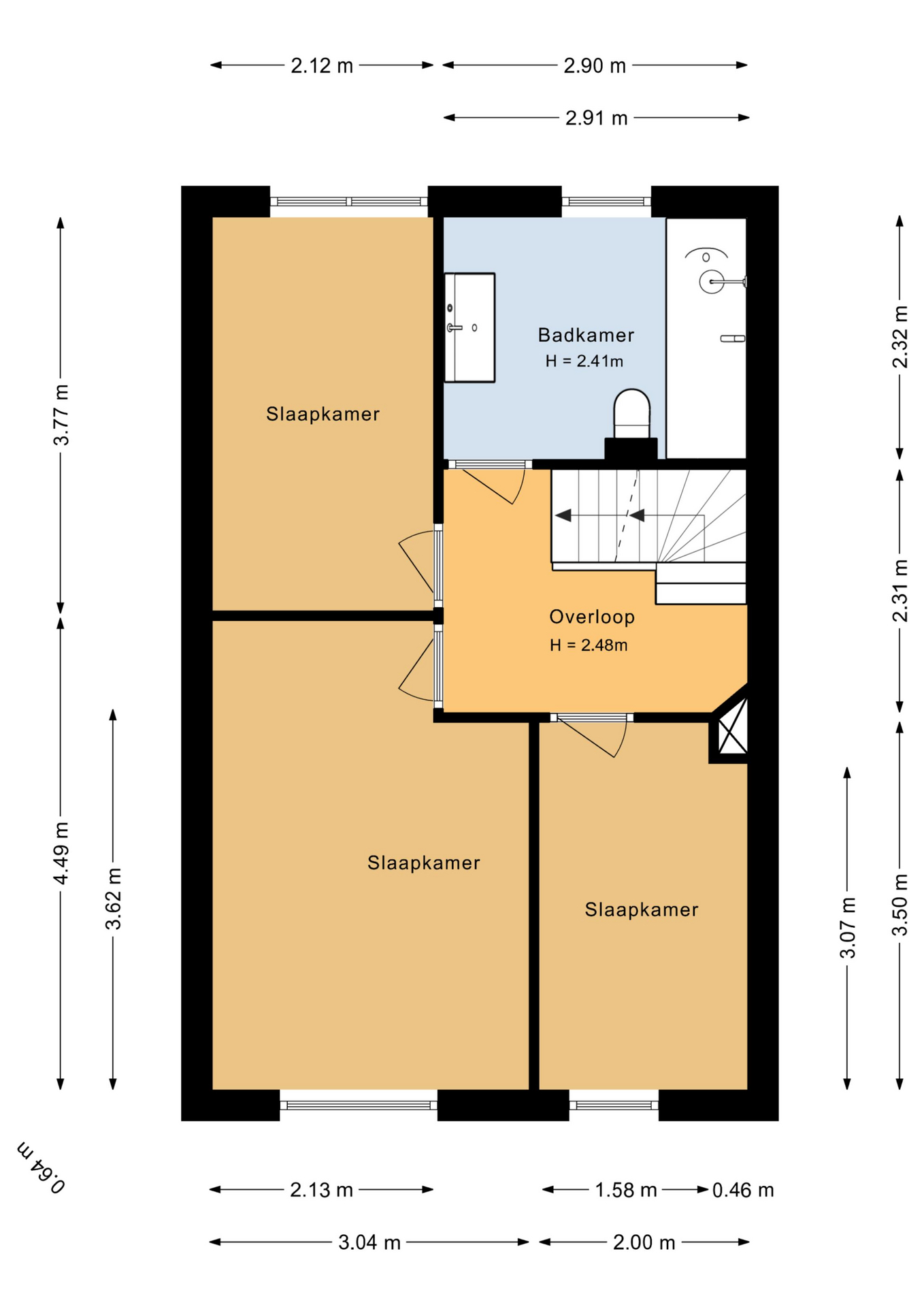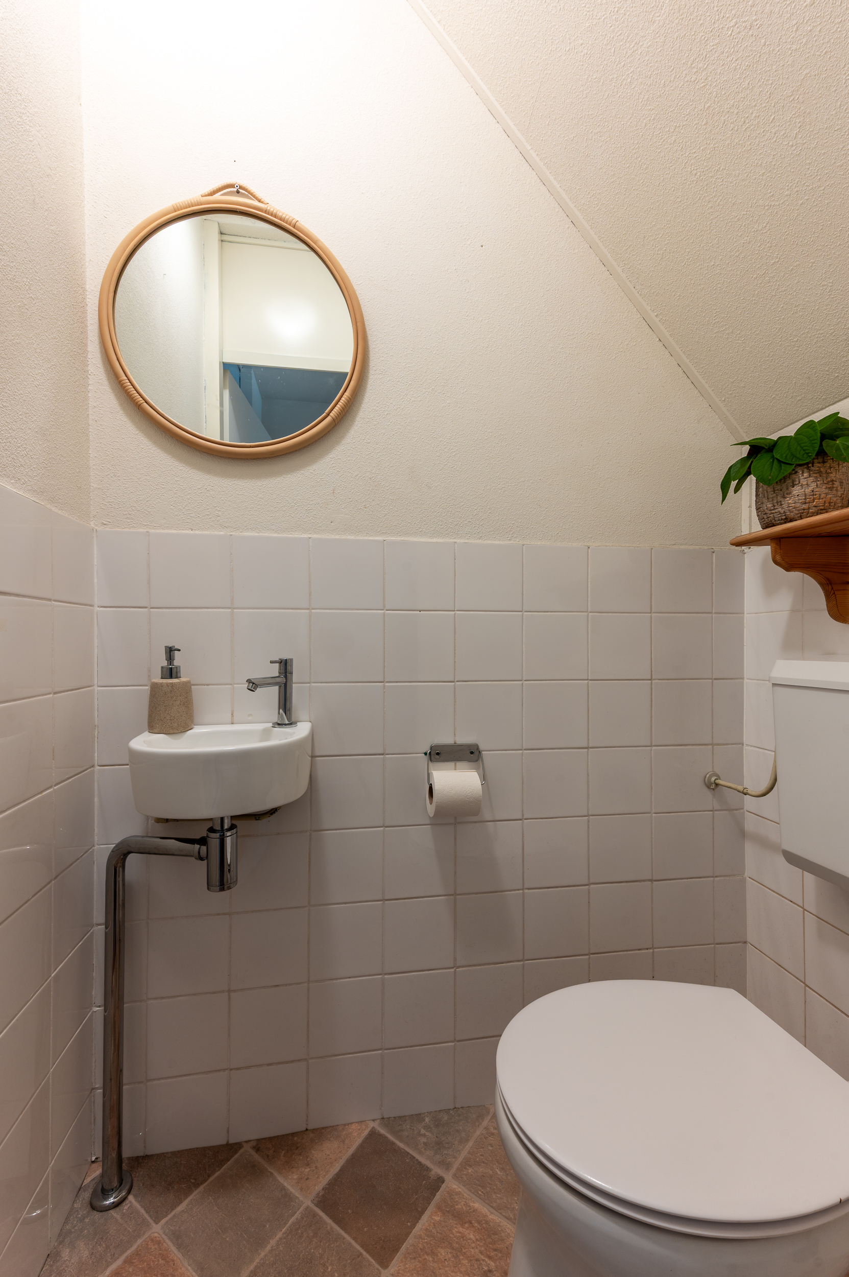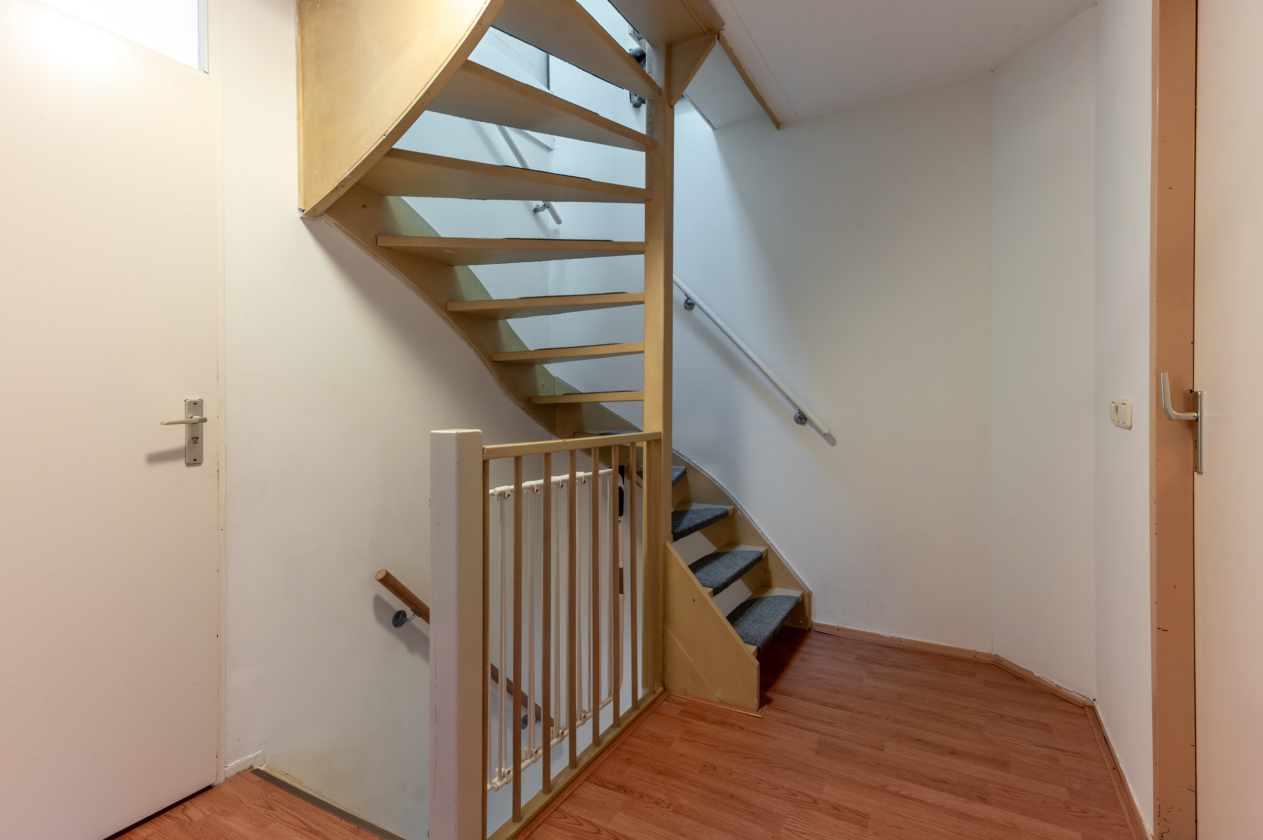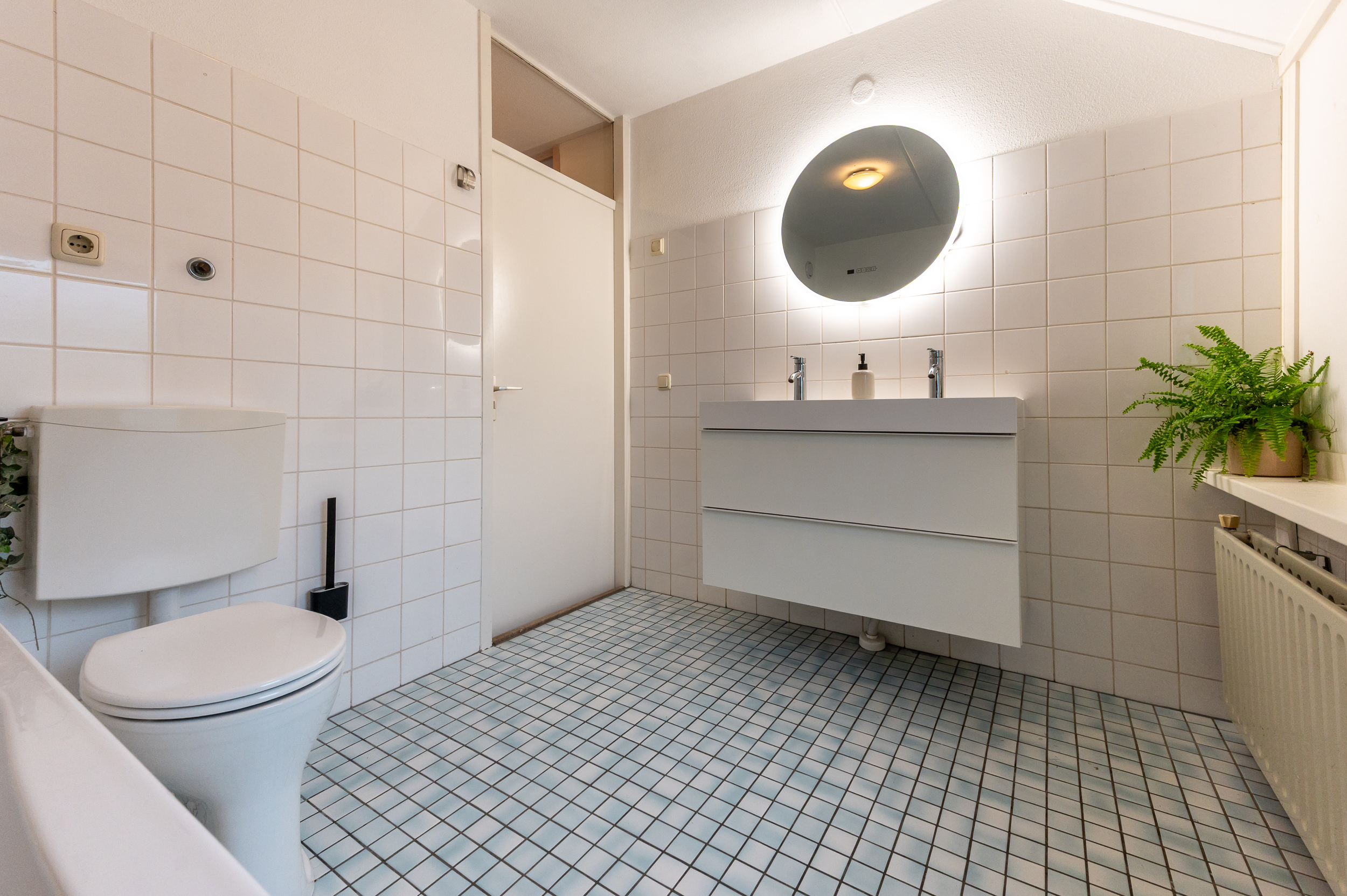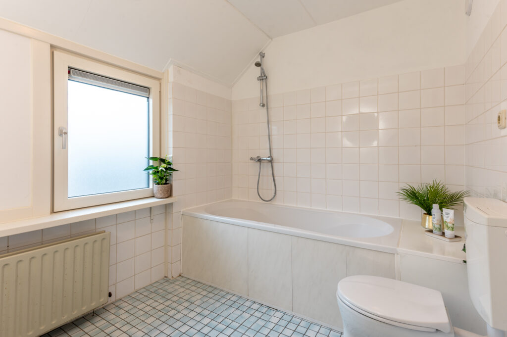 Overloop met toegang tot 3 ruime slaapkamers (ca. 13 / 8 / 7 m2). Keurige badkamer met een ligbad, 2e toilet, wastafelmeubel, radiator en een raam voor de natuurlijke ventilatie. De verdieping is voorzien van een laminaatvloer.
