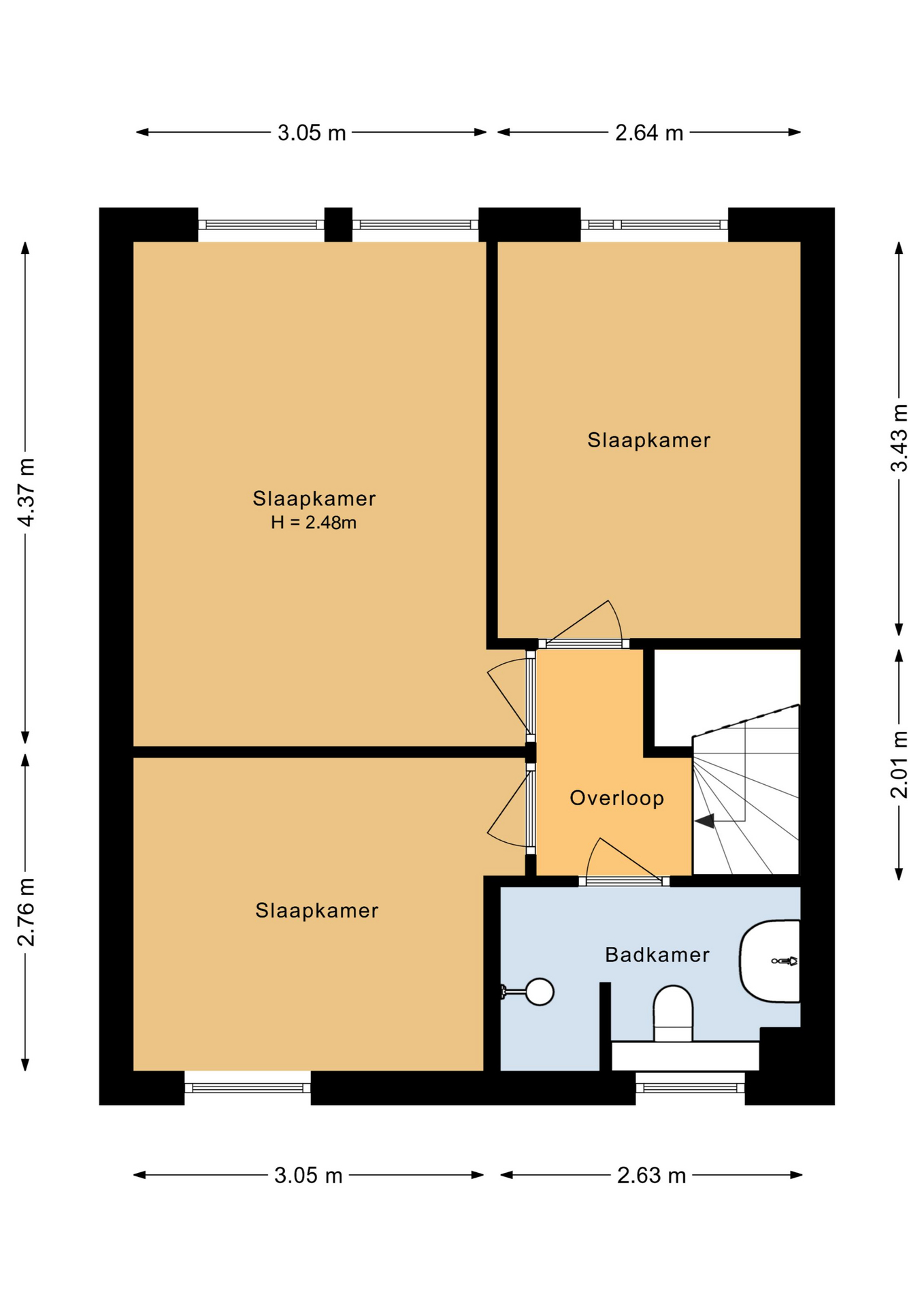 Eerste verdieping: Overloop met toegang tot 3 ruime slaapkamers (ca. 13 / 9 / 8 m²) en de badkamer. Nette volledig betegelde badkamer voorzien van een ruime inloopdouche, toilet en een wastafelmeubel. De verdieping is voorzien van een laminaatvloer.