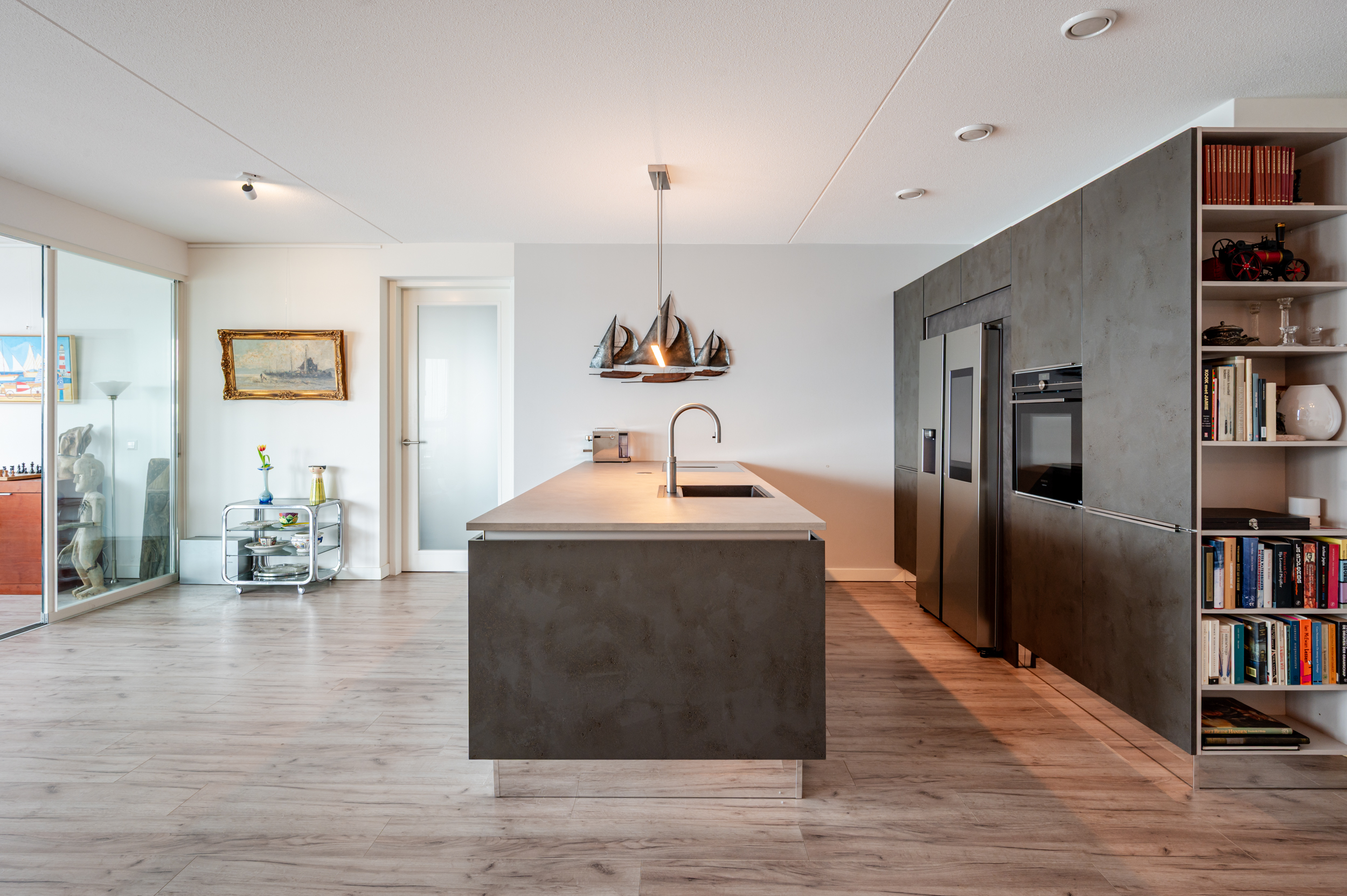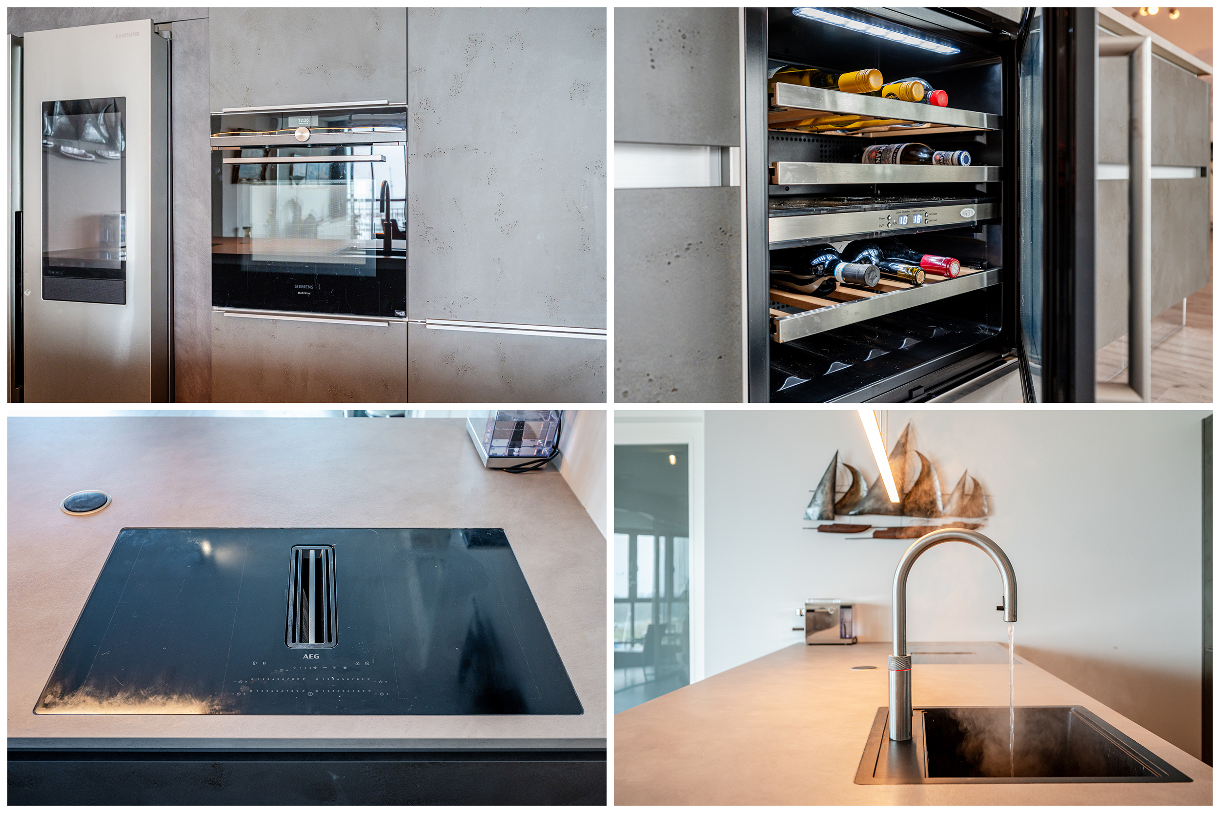 De open keuken met veel kast- en laderuimte heeft een kookeiland. De luxe keuken is voorzien van inbouwapparatuur zoals een Quooker, dubbele vries/koelkast met automaat voor gekoeld water en ijsblokjes en een informatiescherm. Verder een inductie kookplaat met geïntegreerde afzuiging en een combi-oven en een wijnklimaatkast.
