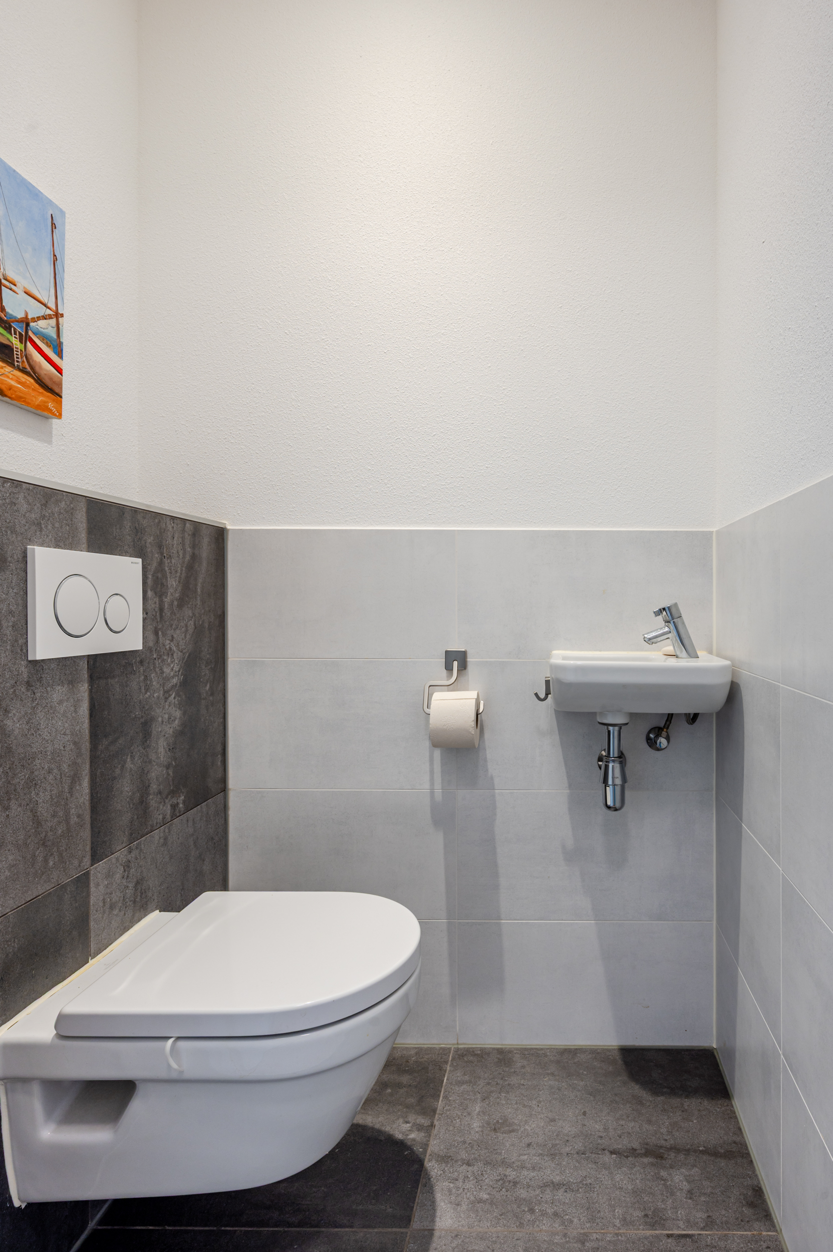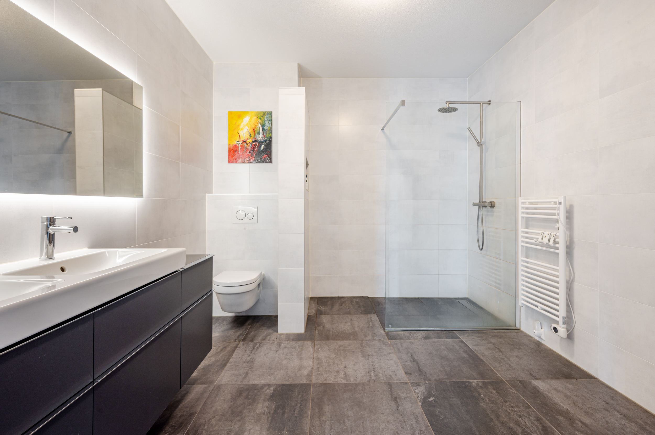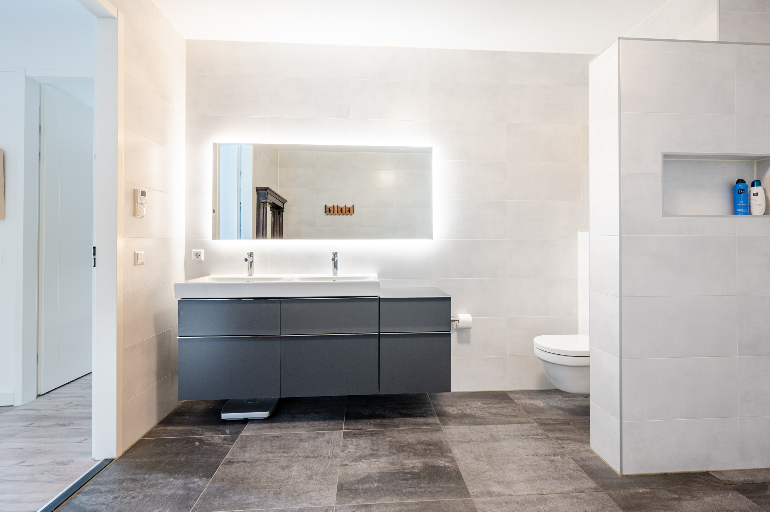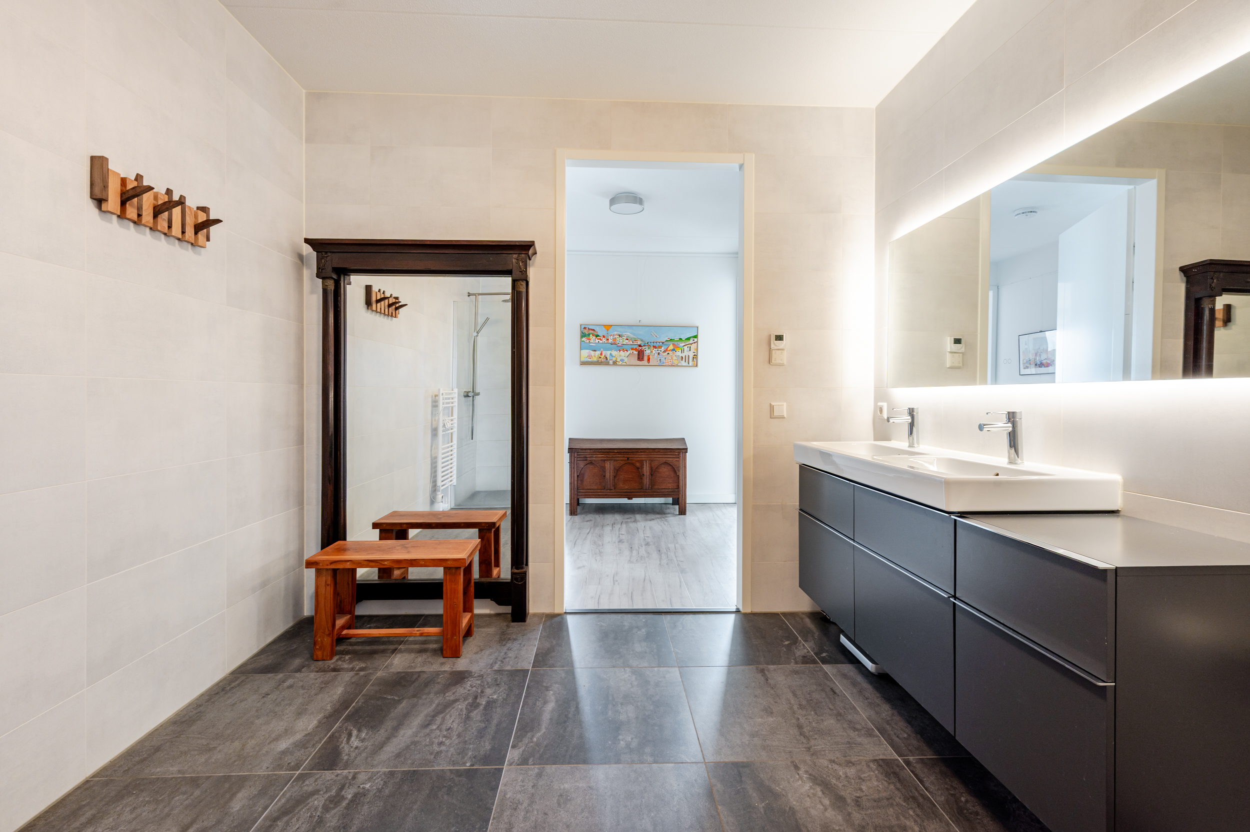 De moderne badkamer is voorzien van een badkamermeubel met dubbele wastafel en grote verwarmde en verlichte spiegel, toilet en inloopdouche met glazen douchewand. De badkamer is tot aan plafond betegeld.