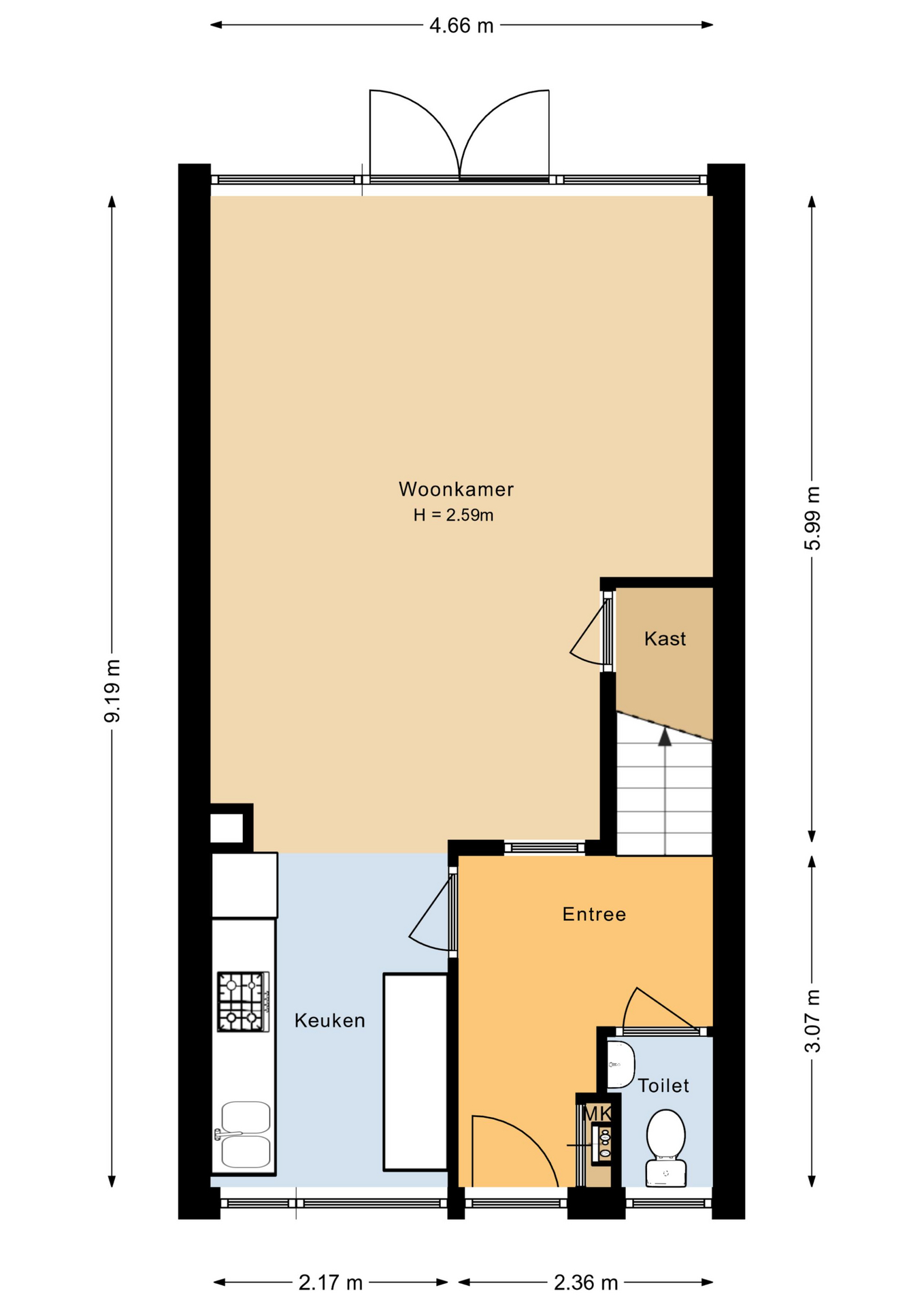 Begane grond: Entree; hal met meterkast, toilet en trapopgang; doorgang naar de keuken v.v. 4-pits gaskookplaat, schouw, oven, magnetron, koelkast, ladenvriezer en een losse vaatwasser; tuingerichte woonkamer (ca. 24m²) met dubbele deur naar de tuin.
