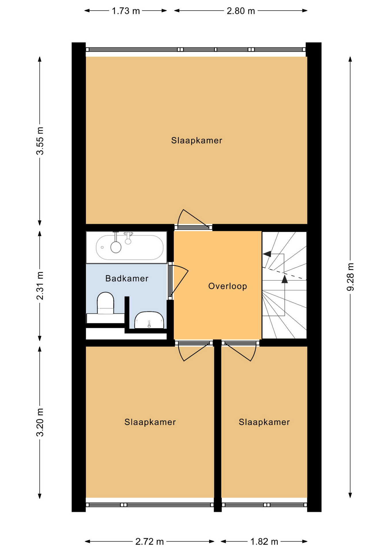 Eerste verdieping: Overloop; drie slaapkamers (resp. ca. 16,7m², 8,6m² en 5,8m²); badkamer v.v. volledige betegeling, toilet, ligbad en wastafel.