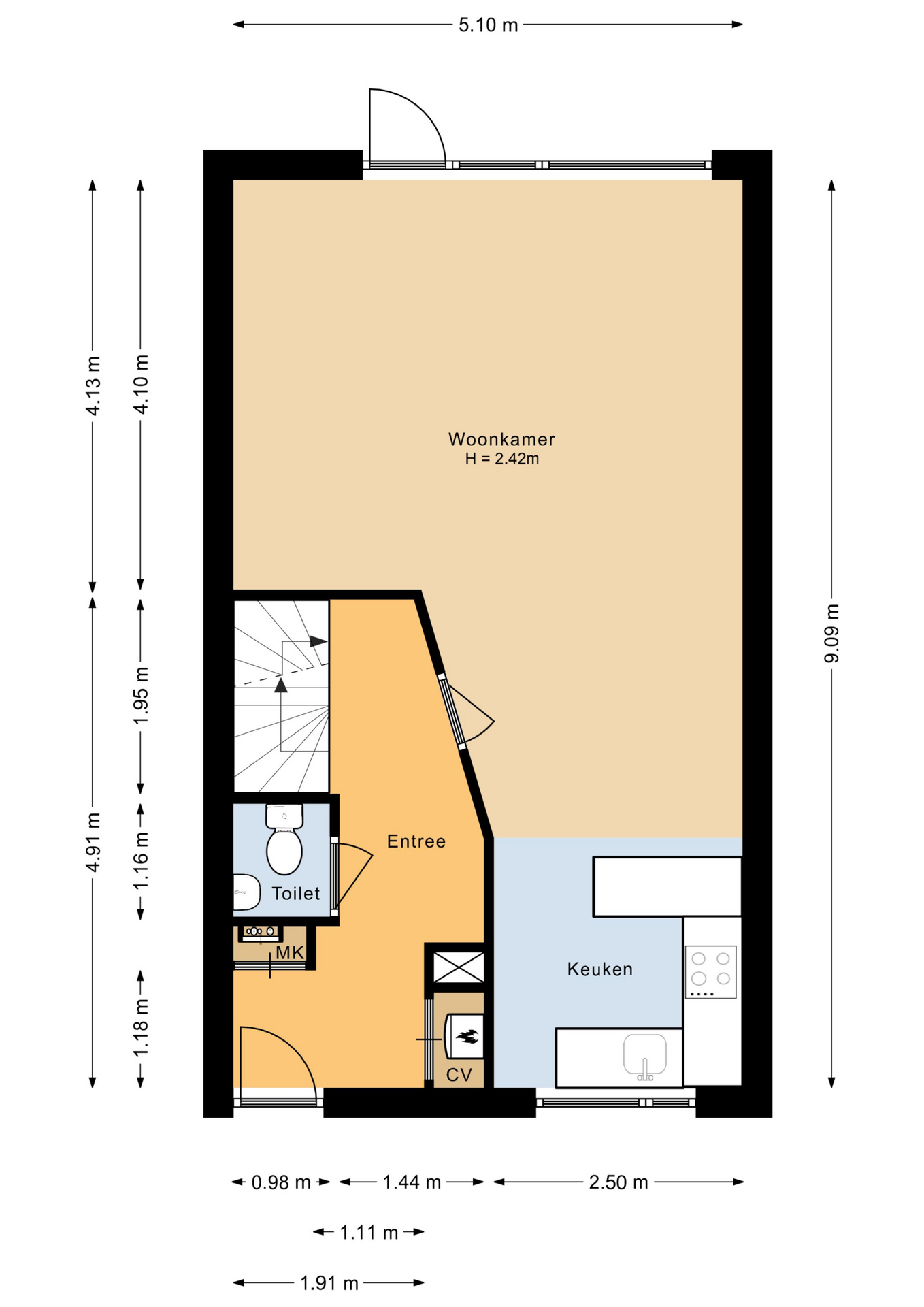Entree, hal, toilet met fonteintje, ruime en lichte woonkamer (ca. 26 m²) met deur naar de achtertuin, straatgerichte open keuken voorzien van diverse inbouwapparatuur.