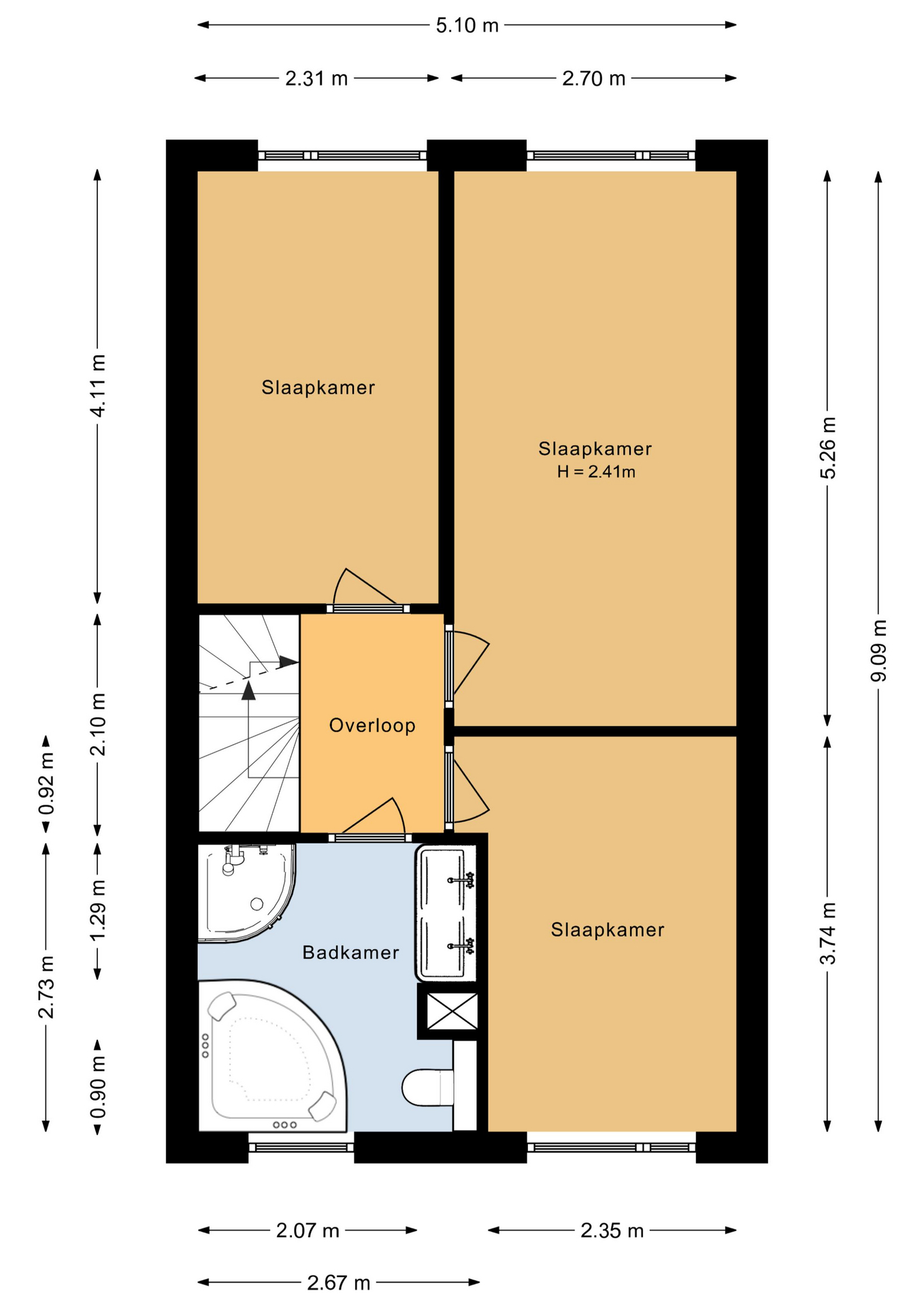 Overloop, slaapkamer 1 (ca. 14 m²), slaapkamer 2 (ca. 9 m²), slaapkamer 3 (ca. 9 m²), badkamer voorzien van dubbele wastafel met meubel, toilet, douchecabine en ligbad.