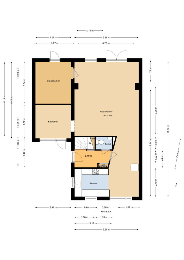 Entree, hal, trapkast, toilet met fonteintje, ruime en lichte woonkamer (ca. 22 m²) met openslaande deuren naar de achtertuin, halfopen keuken in U-opstelling met diverse inbouwapparatuur en graniet werkblad, aparte eetkamer (ca. 9 m²) met deur naar de voortuin, slaapkamer 1 (ca. 10 m²) met deur naar achtertuin.