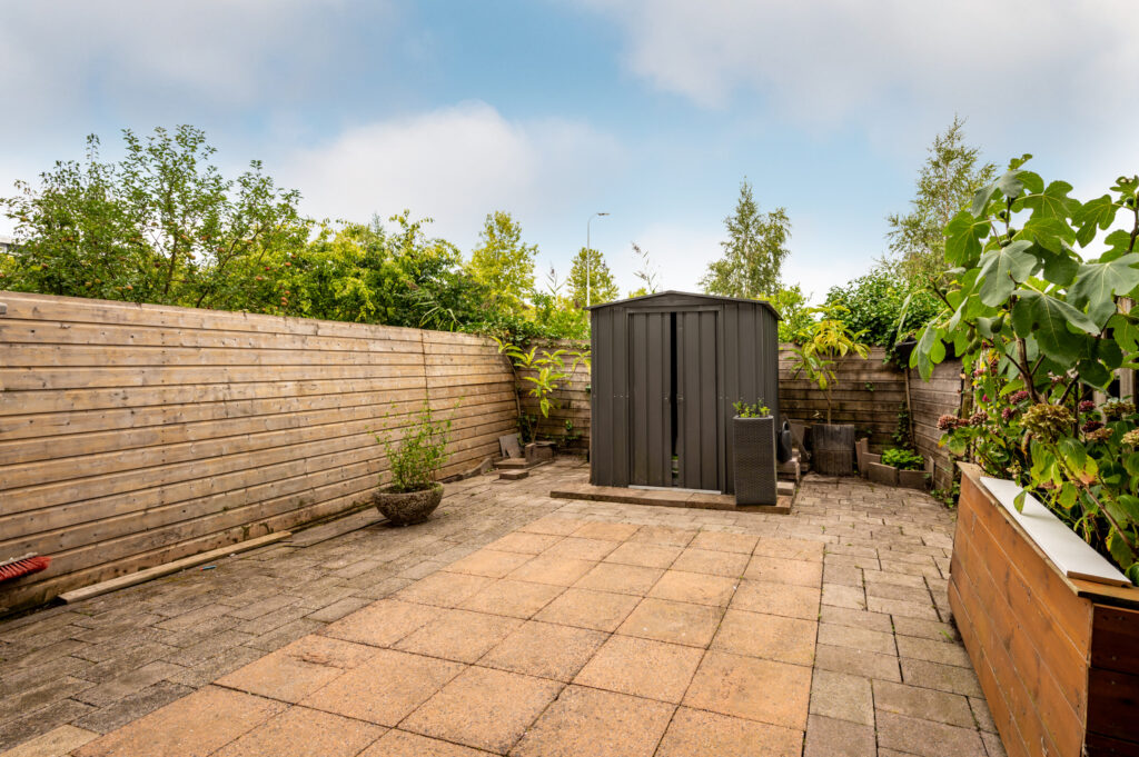 De verzorgd aangelegde tuin is gelegen op het noorden en voorzien van bestrating, houten schuttingen en een vrijstaande aluminium berging. De tuin heeft een vrije ligging aan de achterzijde en geeft veel privacy!
