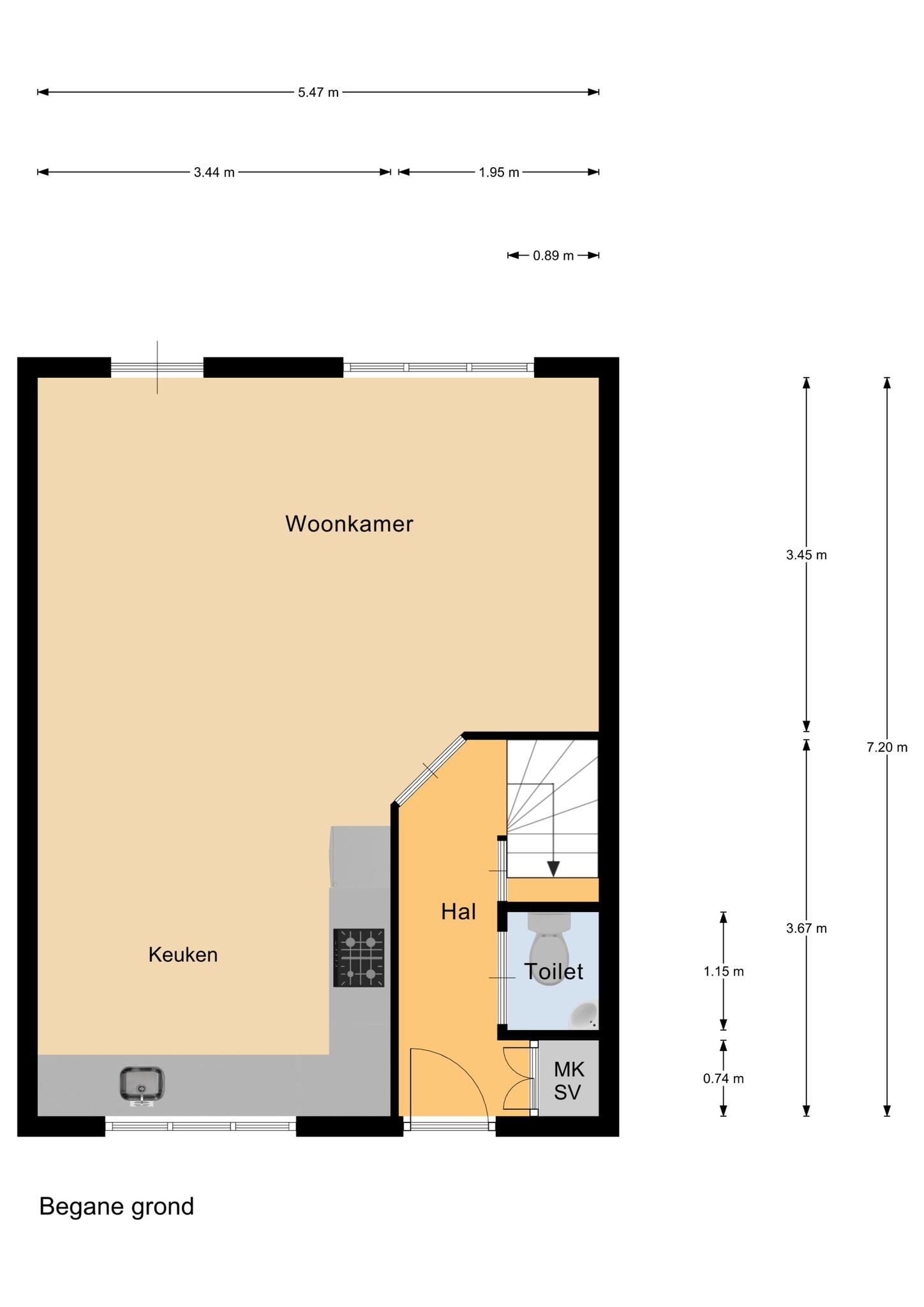 Entree, hal, toilet met fonteintje, ruime woonkamer met openslaande deur naar de tuin, open keuken voorzien van diverse inbouwapparatuur.