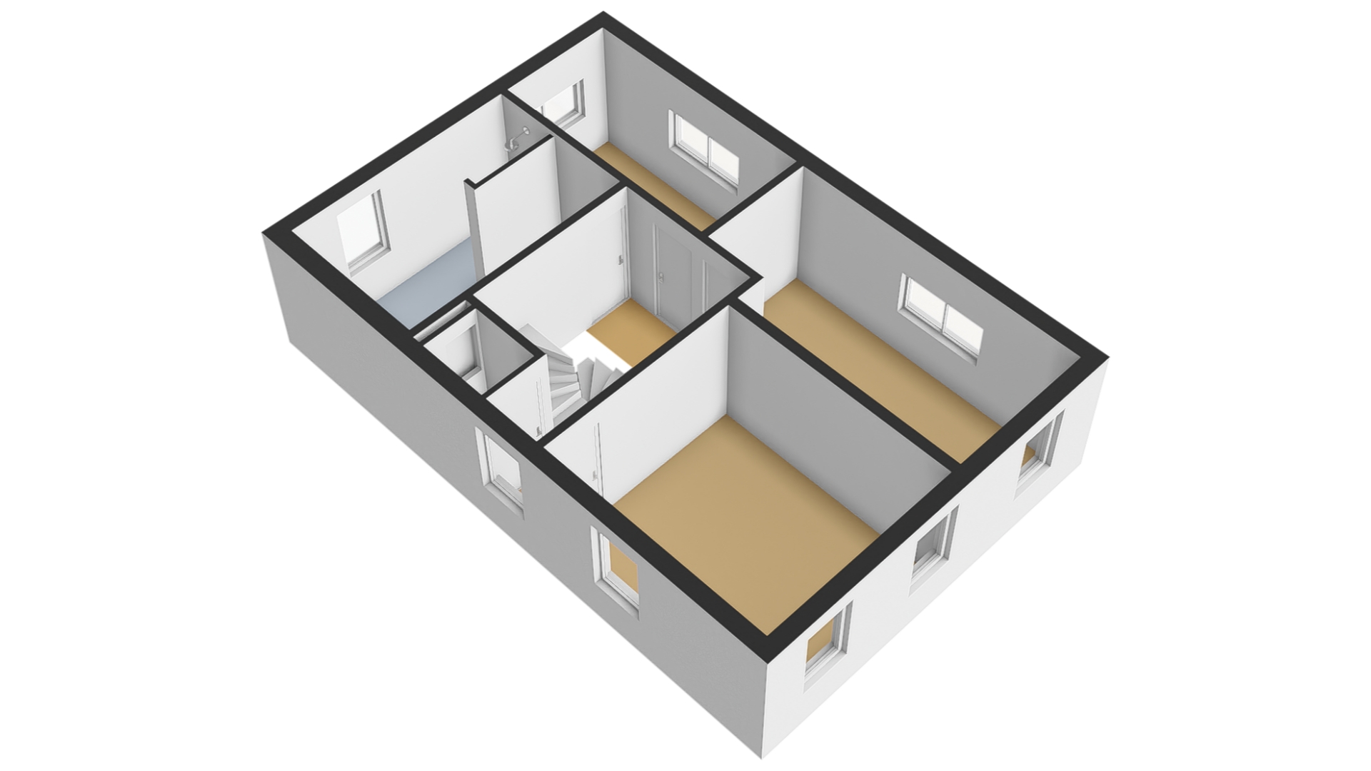 Via de overloop zijn een separate sanitaire ruimte met een vrij hangend toilet en de drie slaapkamers te bereiken.