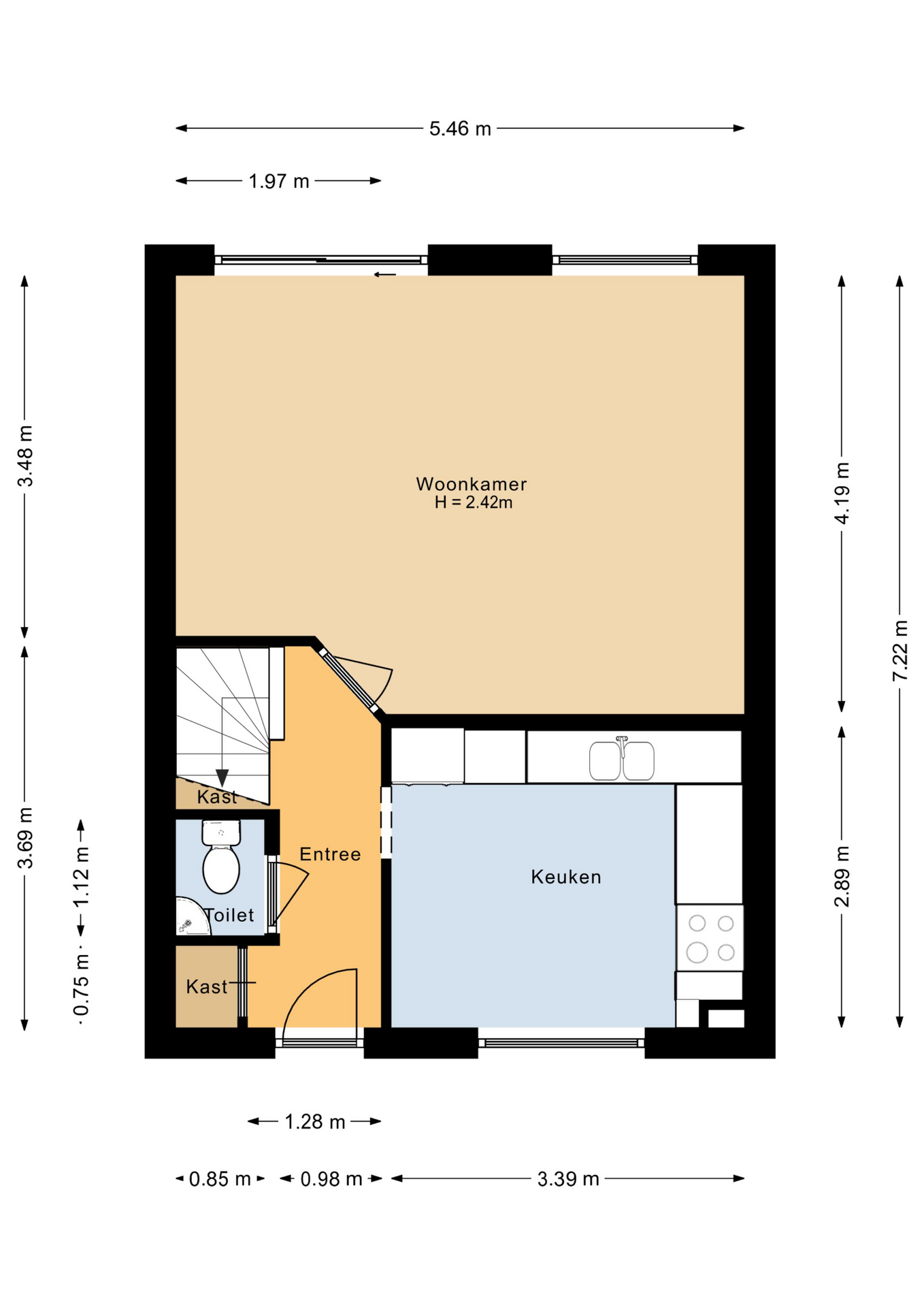 Entree, hal met trapkast, toilet met fonteintje, ruime en lichte woonkamer (ca. 19 m²) met schuifpui naar de tuin, moderne dichte keuken voorzien van diverse inbouwapparatuur.