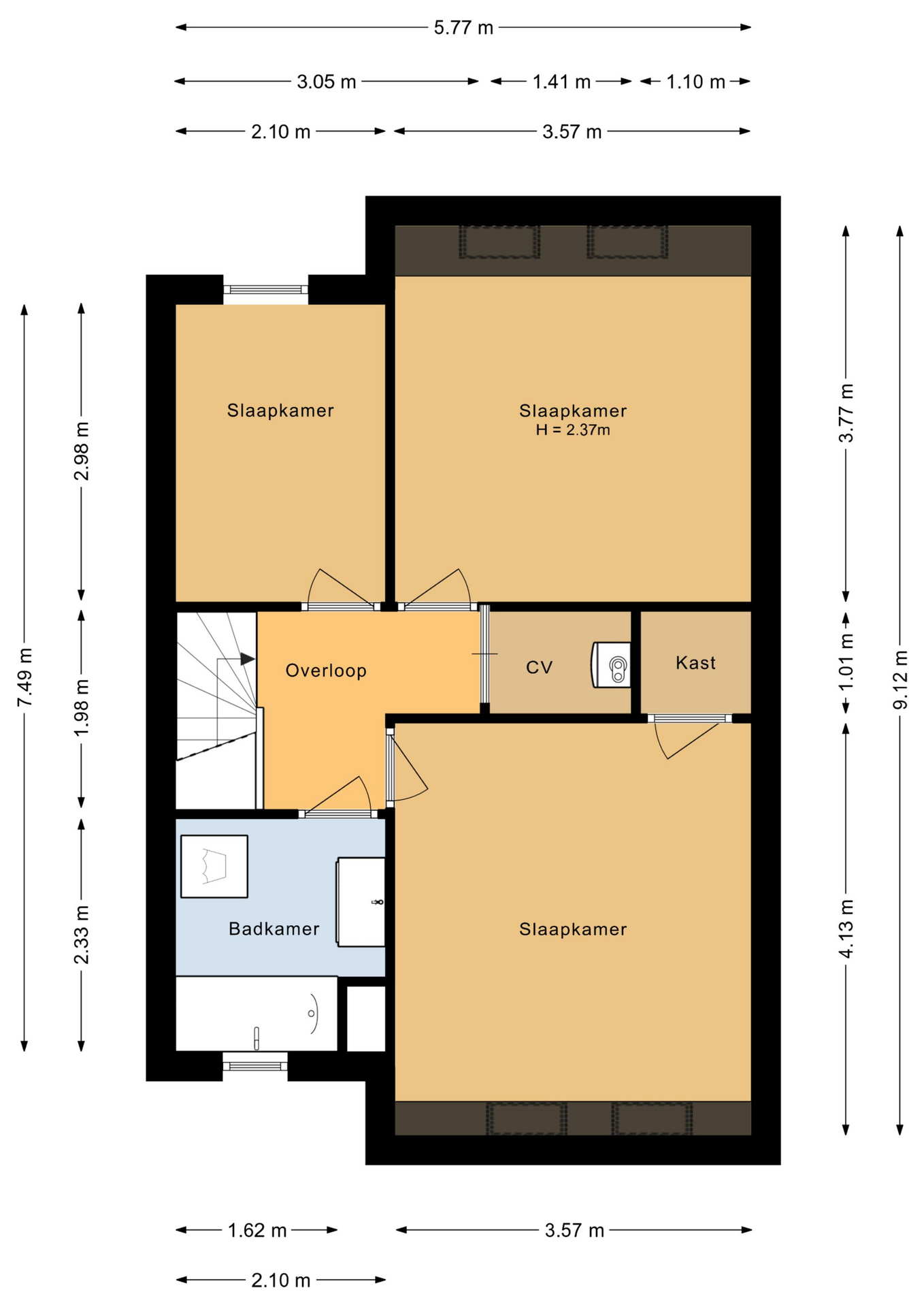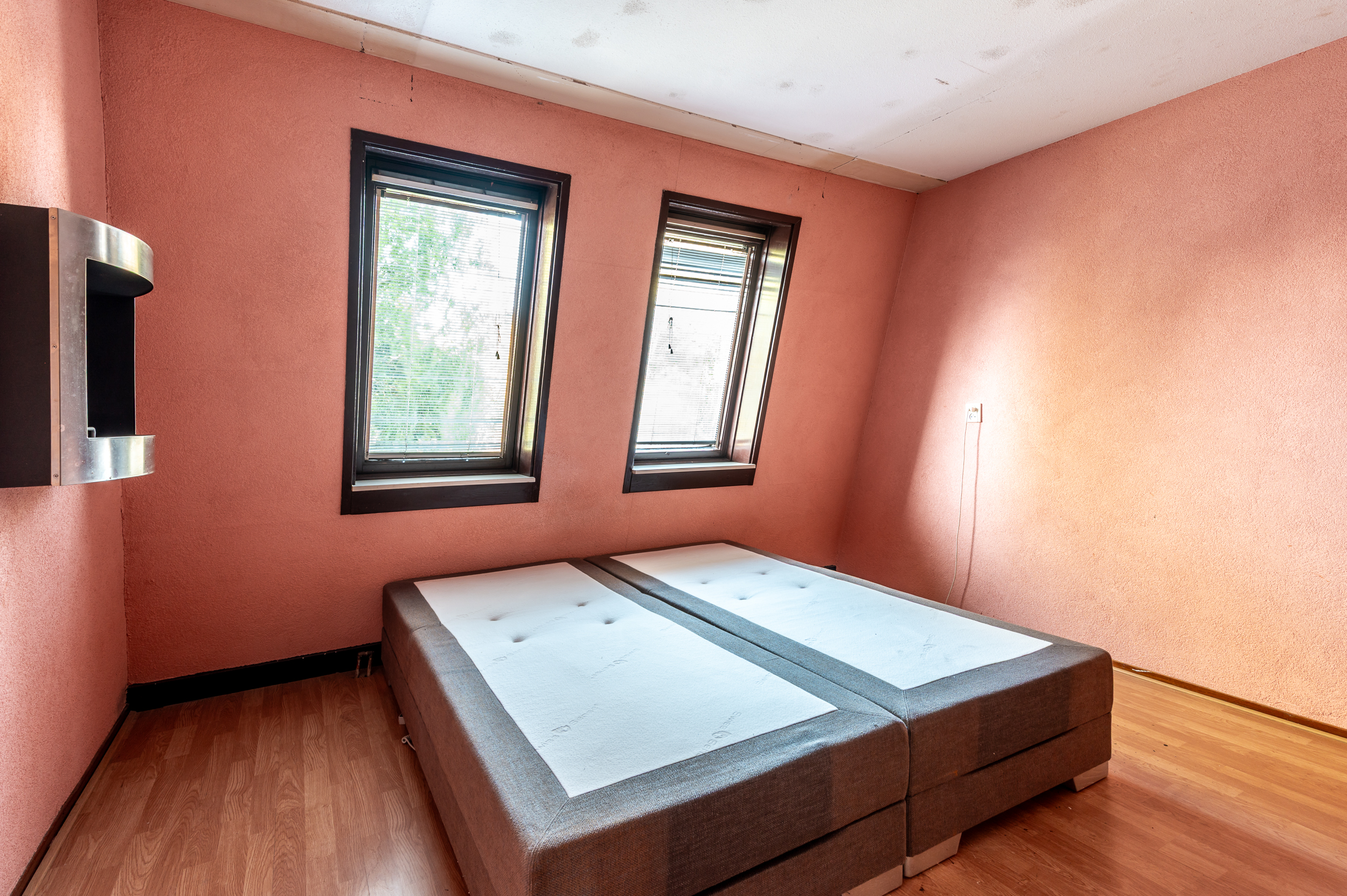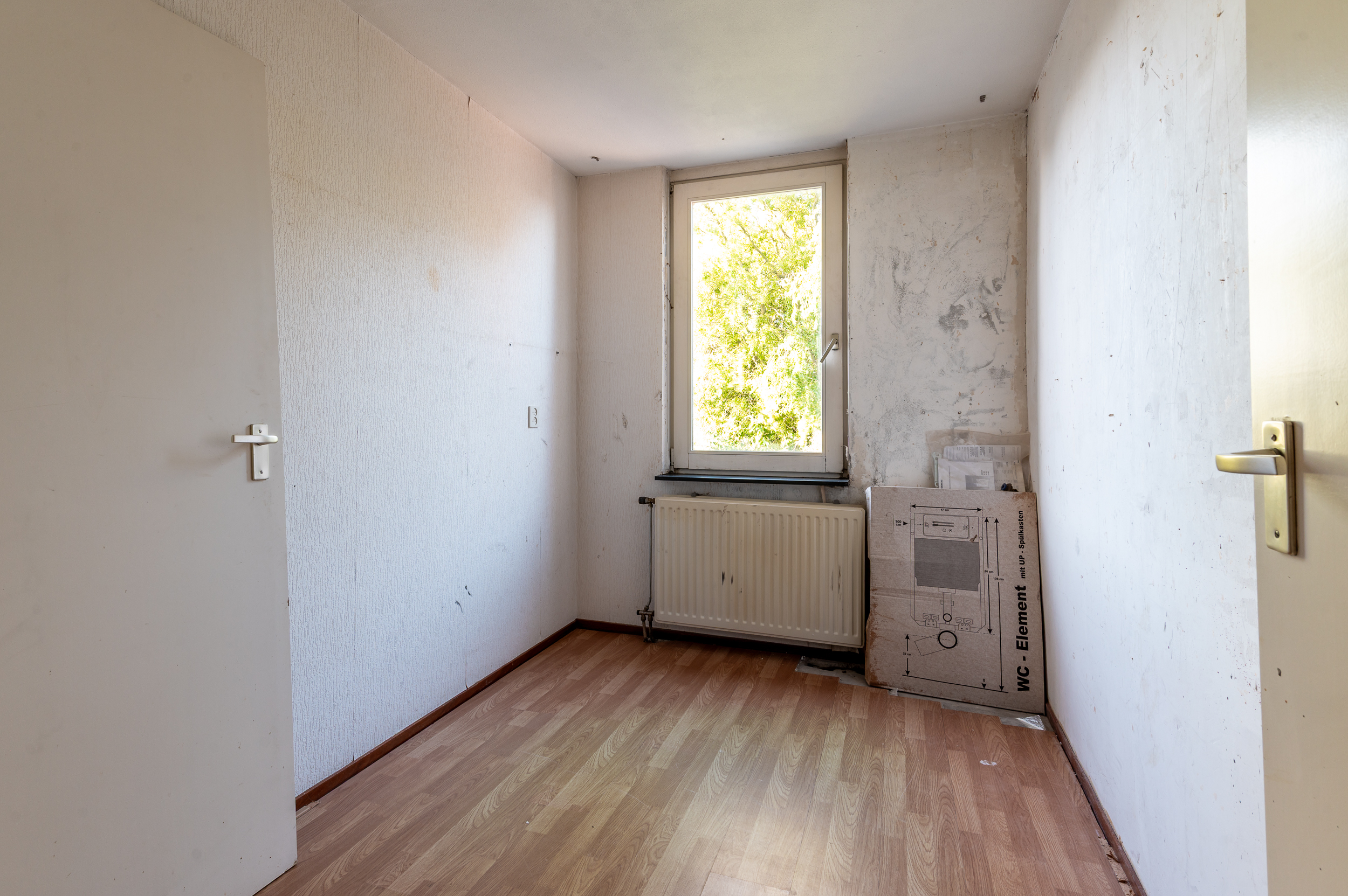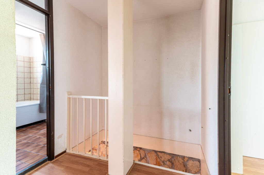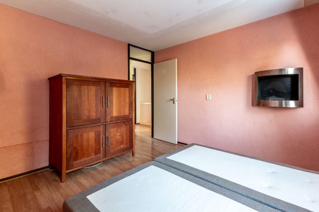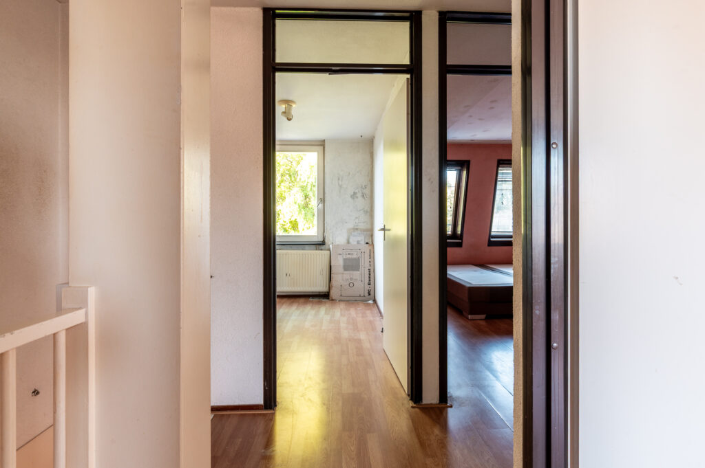 Overloop met toegang tot 3 ruime slaapkamers (ca. 15 / 13 / 6 m2), waarbij de ouderslaapkamer is voorzien van een ingebouwde kast. Standaard badkamer met een ligbad, wastafelmeubel, radiator, de wasmachineaansluiting en een raam voor de natuurlijke ventilatie. Technische ruimte met de opstelplaats van de cv-ketel en veel praktische bergruimte. De verdieping is voorzien van een laminaatvloer.