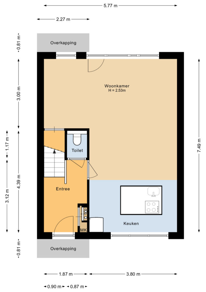 Entree/hal met de meterkast, garderobe, toiletruimte, trapopgang naar de verdieping en toegang naar de keuken/woonkamer. Een heerlijke tuingerichte woonkamer van 5.77 meter breed met grote raampartijen (veel lichtinval), een praktische bergkast en een deur naar de tuin. Aan de voorzijde bevindt zich de keuken met kookeiland, welke voorzien is van de volgende apparatuur; oven, vaatwasser, inductiekookplaat, afzuigkap en een losse koel/vriescombinatie. Ruime opstelmogelijkheden voor een grote eettafel waar u heerlijk met vrienden en familie kunt dineren. De begane grond is voorzien van een moderne tegelvloer met vloerverwarming.