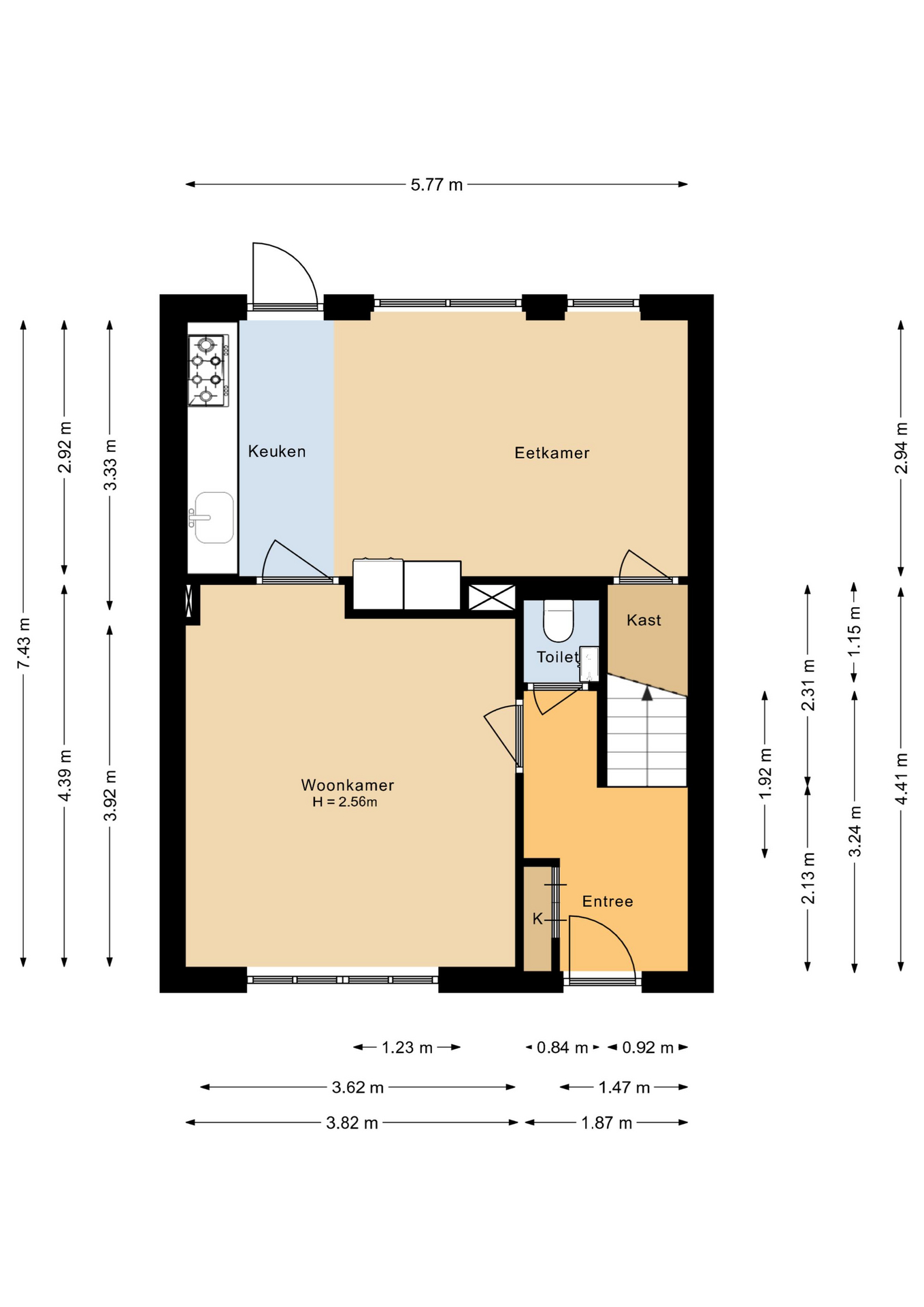 Entree/hal met de meterkast, toiletruimte, trapopgang naar de verdieping en toegang naar de woonkamer. Ruime straatgerichte woonkamer met grote raampartijen en een laminaatvloer. Aan de achterzijde bevindt zich de nette inbouwkeuken, welke voorzien is van de volgende apparatuur; koelkast, vaatwasser, combi-oven, 5-pits gaskookplaat en een afzuigkap. Ruime opstelmogelijkheden voor een grote eettafel waar u heerlijk met uw familie kunt dineren. Praktische bergkast en een deur naar de tuin.