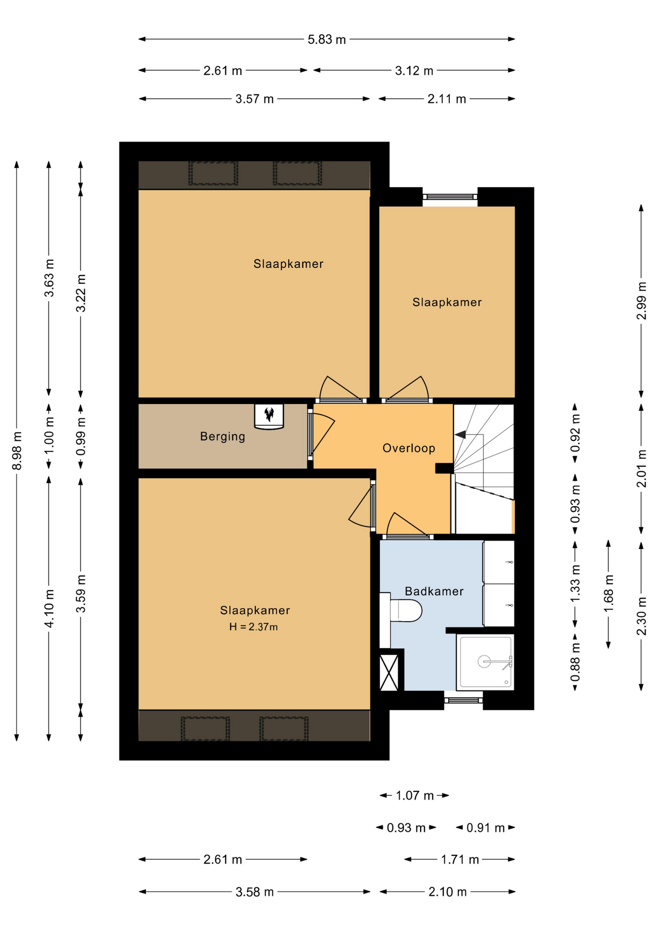 Overloop met toegang tot 3 ruime slaapkamers (ca. 13 / 12 / 6 m2). Volledig betegelde badkamer met een inloopdouche (2022), 2e toilet, wastafelmeubel met dubbel kraan, een radiator en een raam voor de natuurlijke ventilatie. Technische ruimte met de opstelplaats van de cv-ketel (2009) en de wasmachine/droger aansluiting. De verdieping is voorzien van een laminaatvloer.