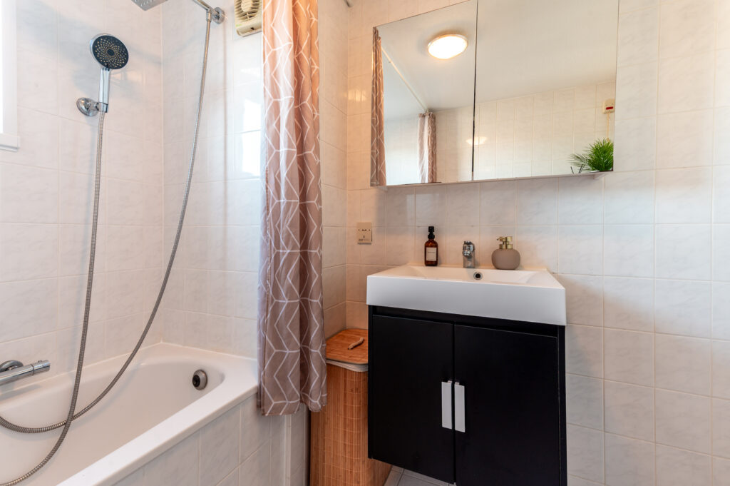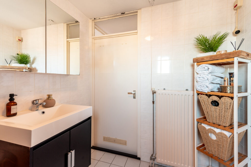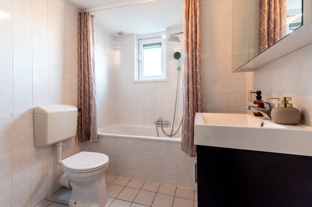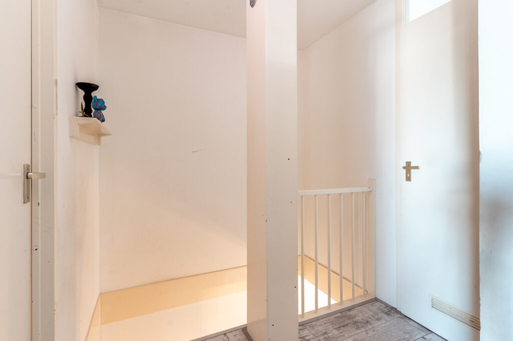 Overloop met toegang tot 3 ruime slaapkamers (ca. 14 / 13 / 6 m2), waarbij de ouderslaapkamer is voorzien van een ingebouwde kast. Keurige badkamer met een ligbad, wastafelmeubel, radiator en een raam voor de natuurlijke ventilatie. Technische ruimte met de opstelplaats van de cv-ketel (2024), de wasmachine/droger aansluiting en veel praktische bergruimte. De verdieping is voorzien van een laminaatvloer.
