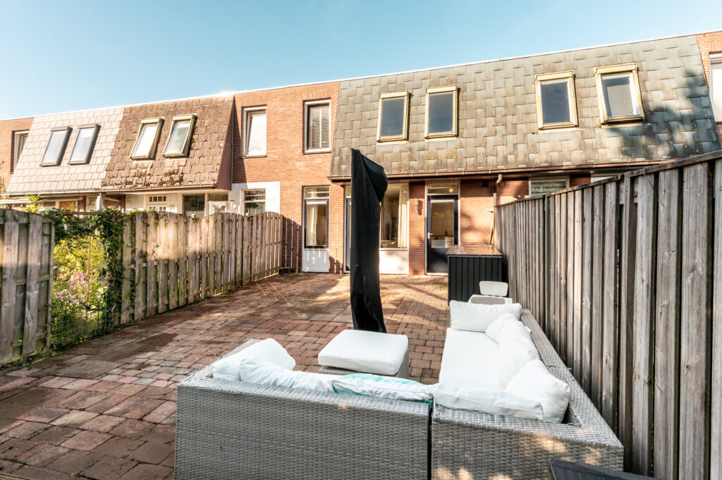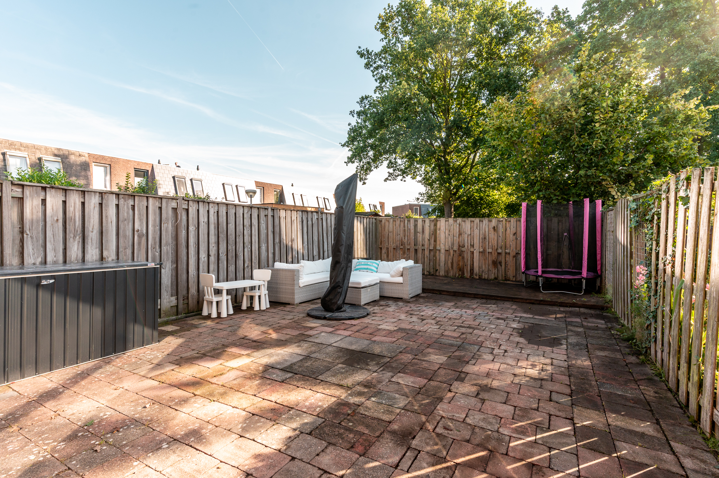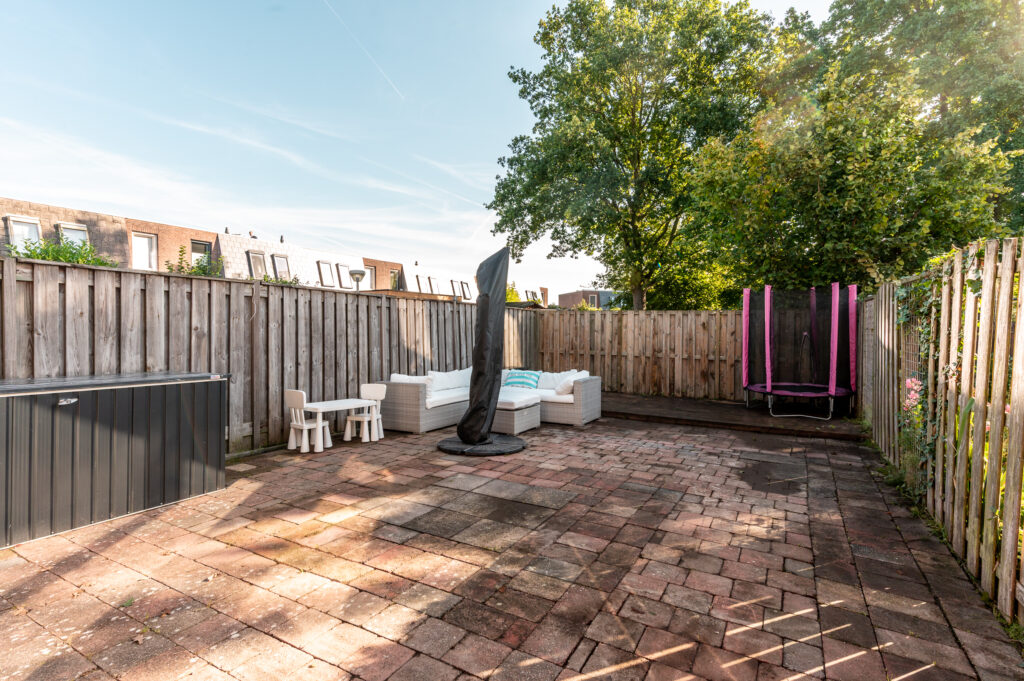 De verzorgd aangelegde tuin is gelegen op het oosten en voorzien van een groot terras met bestrating, een vlonderterras en wordt omheind middels schuttingen. De tuin is onderhoudsarm aangelegd en geeft veel privacy!