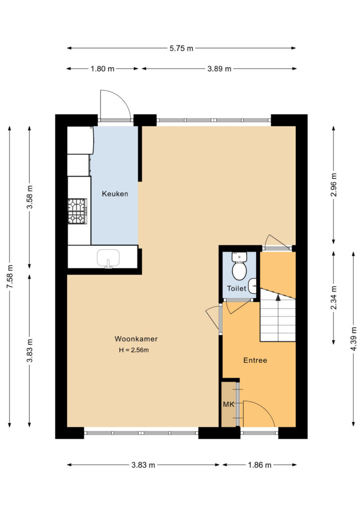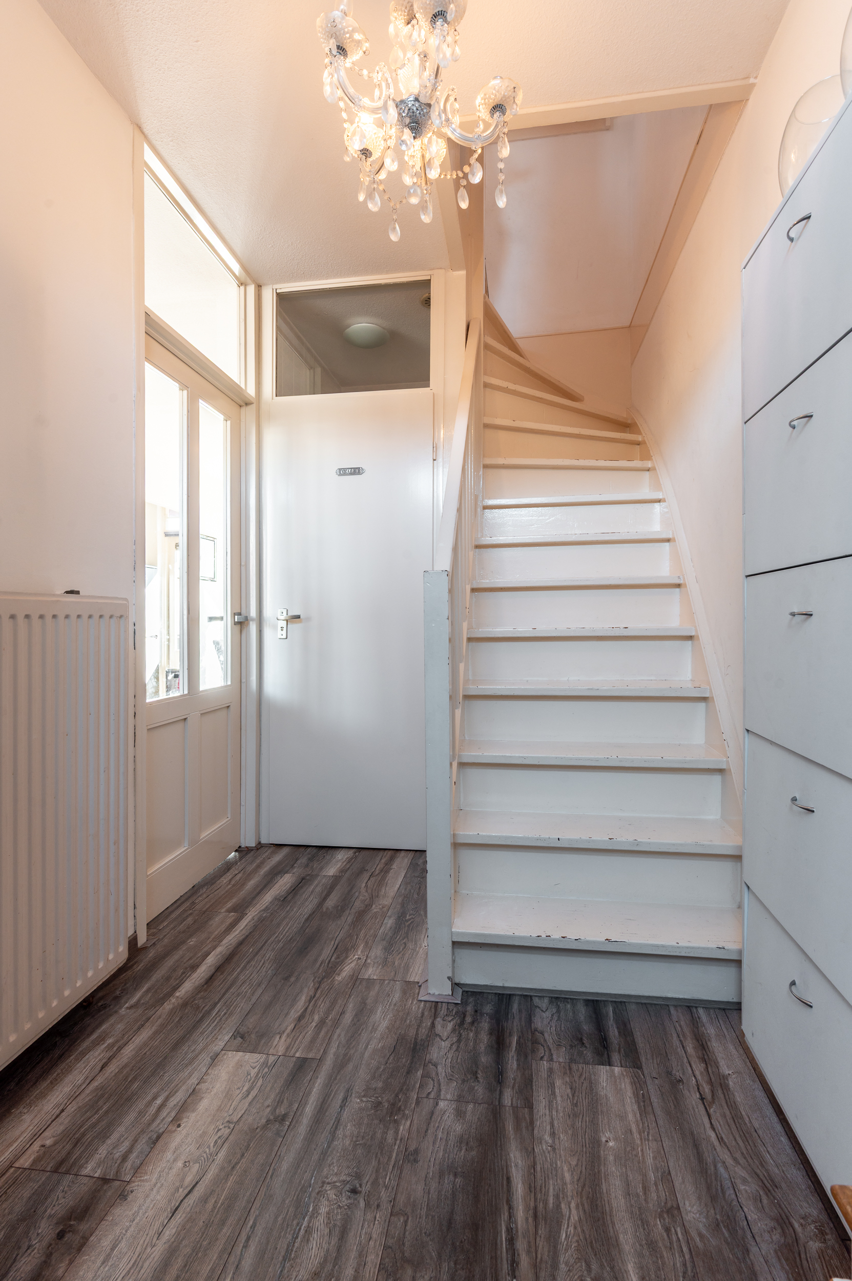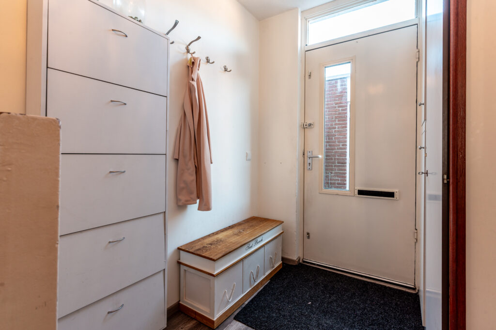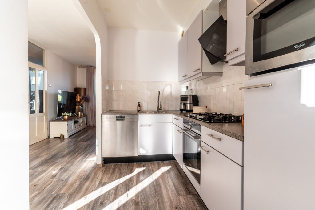 Entree/hal met de meterkast, garderobe, toiletruimte, trapopgang naar de verdieping en toegang naar de woonkamer. De straatgerichte woonkamer van 3.83 meter breed is voorzien van grote raampartijen (veel lichtinval) en is een heerlijke ruimte om te ontspannen en tot rust te komen. Aan de achterzijde bevindt zich de inbouwkeuken in L-opstelling, welke voorzien is van de volgende apparatuur; oven, combimagnetron, vaatwasser, 5-pits gaskookplaat, afzuigkap (2025) en een losse koel/vriescombinatie. Ruime opstelmogelijkheden voor een grote eettafel waar u heerlijk met vrienden en familie kunt dineren. Verder kunt u uw dagelijkse spullen kwijt in de praktische bergkast. De begane grond is voorzien van een laminaatvloer.