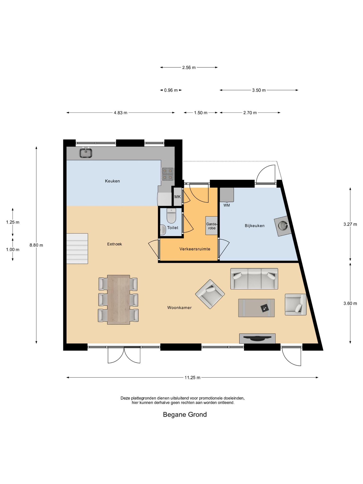 Entree/hal met de meterkast, toiletruimte, garderobe, toegang naar de woonkamer en de inpandige berging/bijkeuken met een wastafel, opstelling voor de wasmachine/droger en veel praktische bergruimte. Riante tuingerichte woonkamer (11.25 m. breed) met grote raampartijen en middels dubbele openslaande deuren toegang naar de fraai aangelegde tuin. Ruime opstelmogelijkheden voor een grote eettafel waar u heerlijk met uw familie kunt dineren. Aan de voorzijde bevindt zich de inbouwkeuken in L-opstelling, welke voorzien is van de volgende apparatuur; koelkast, vriezer, vaatwasser, combi-oven/combimagnetron, 4-pits keramische kookplaat en een afzuigkap. De begane grond is voorzien van een laminaatvloer in tegelmotief.