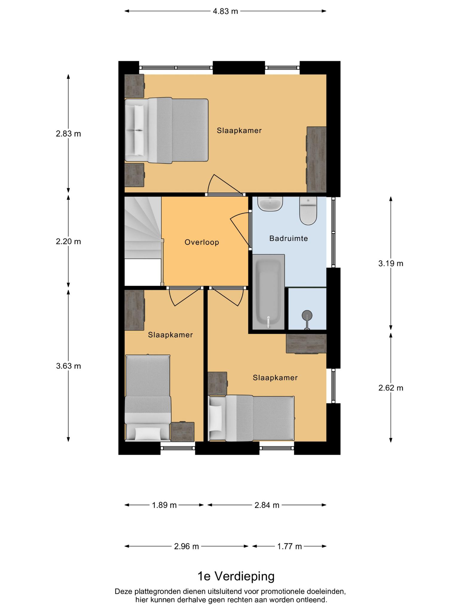 Overloop met toegang tot 3 in grote variërende slaapkamers (ca. 14 / 9 / 7 m2), waarvan de ouderslaapkamer over de volle breedte van de woning. Vergrootte, geheel betegelde badkamer (2007) met een douche, ligbad, 2e toilet, wastafelmeubel, een designradiator, mechanische ventilatie en een raam voor de natuurlijke ventilatie. De verdieping is voorzien van een laminaatvloer.