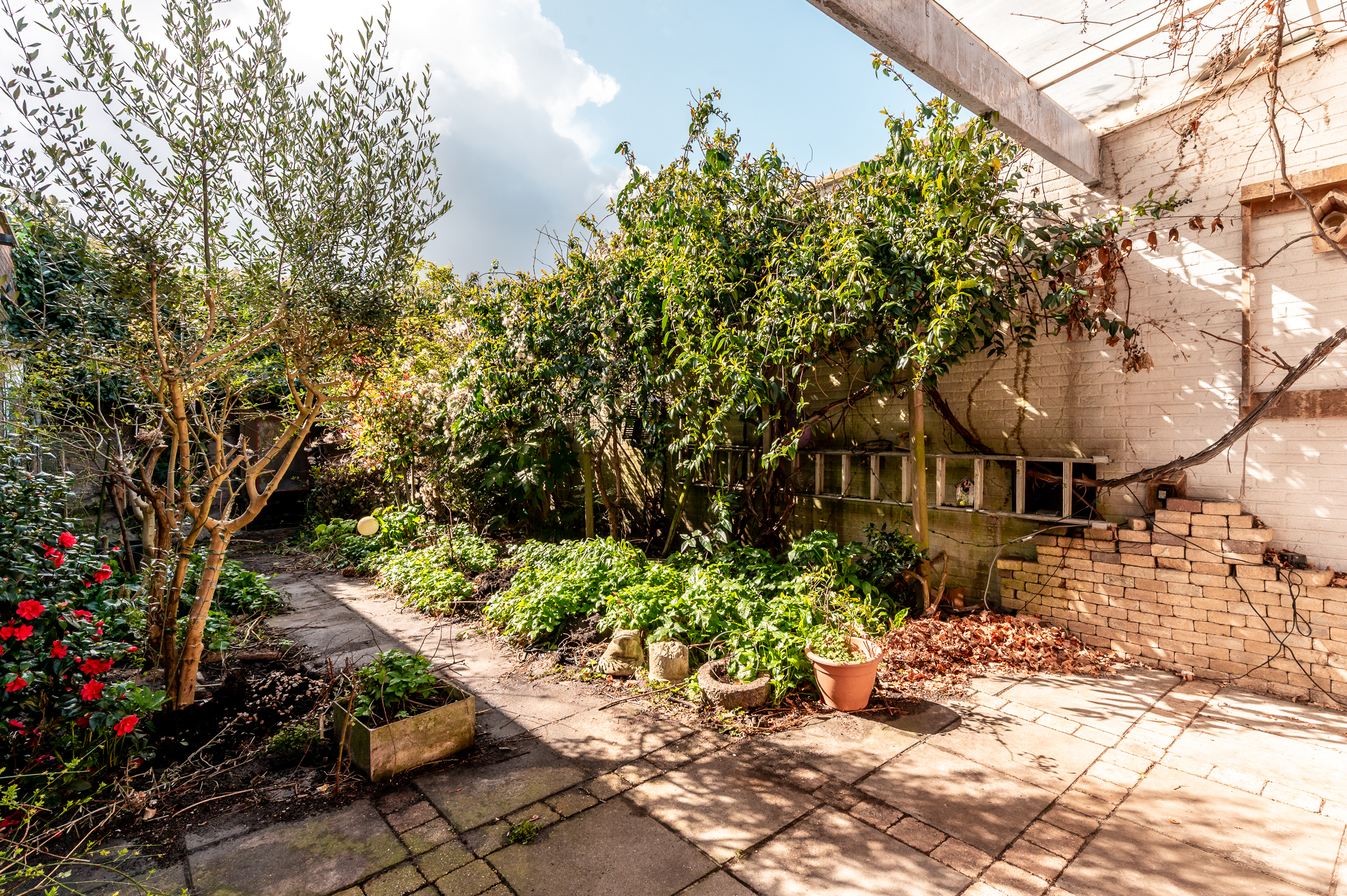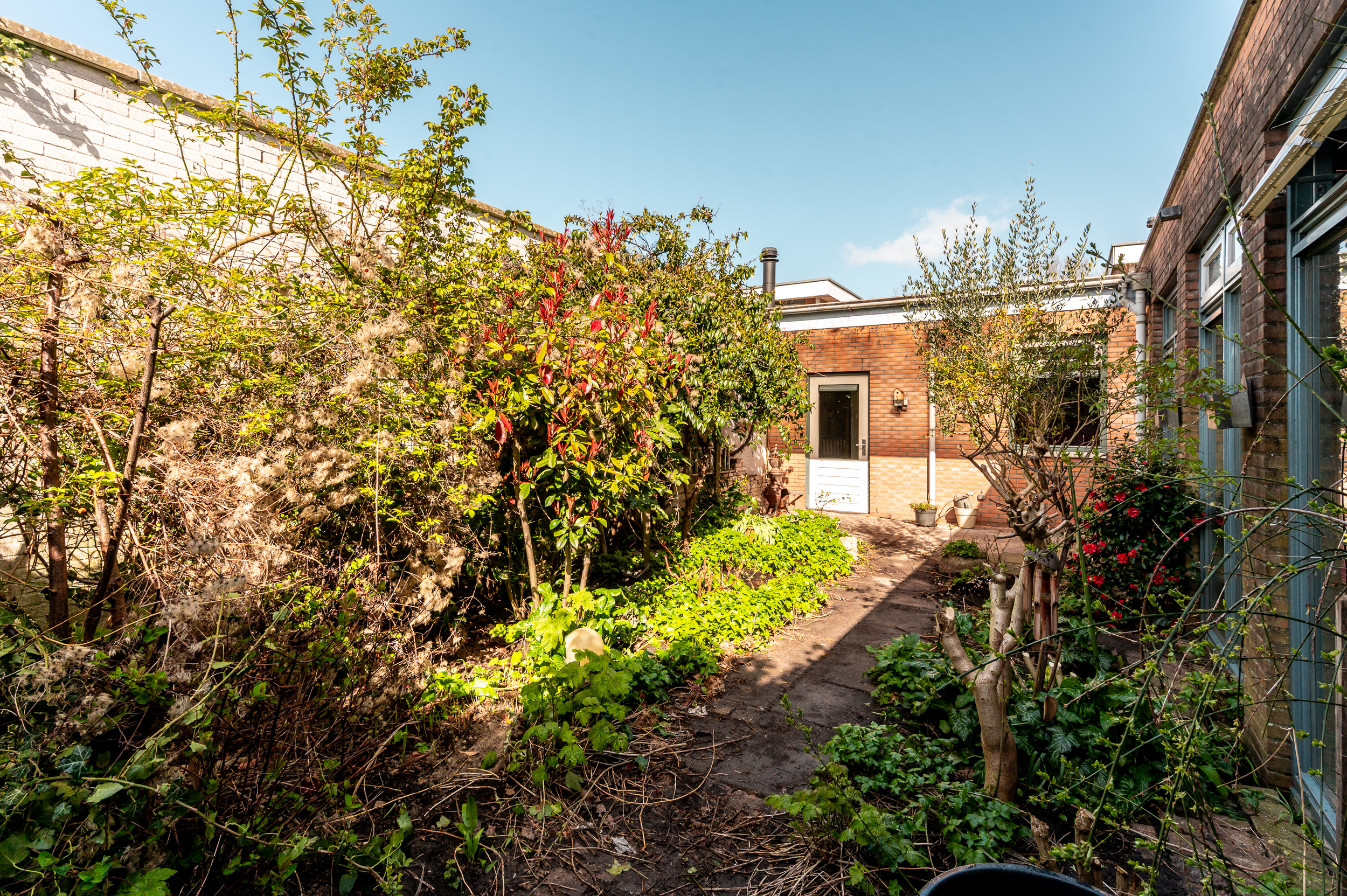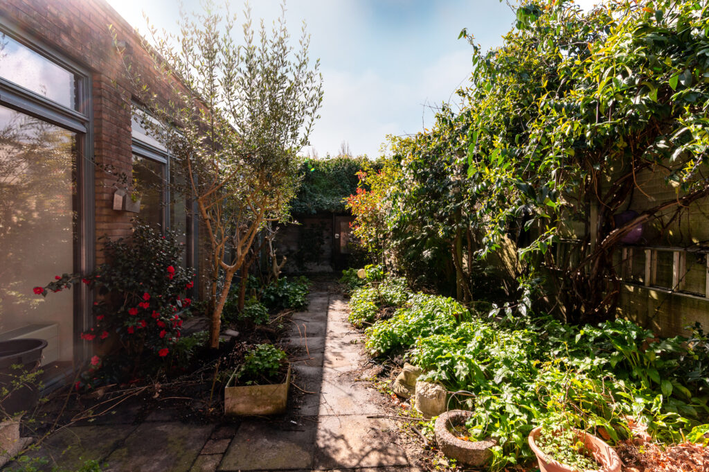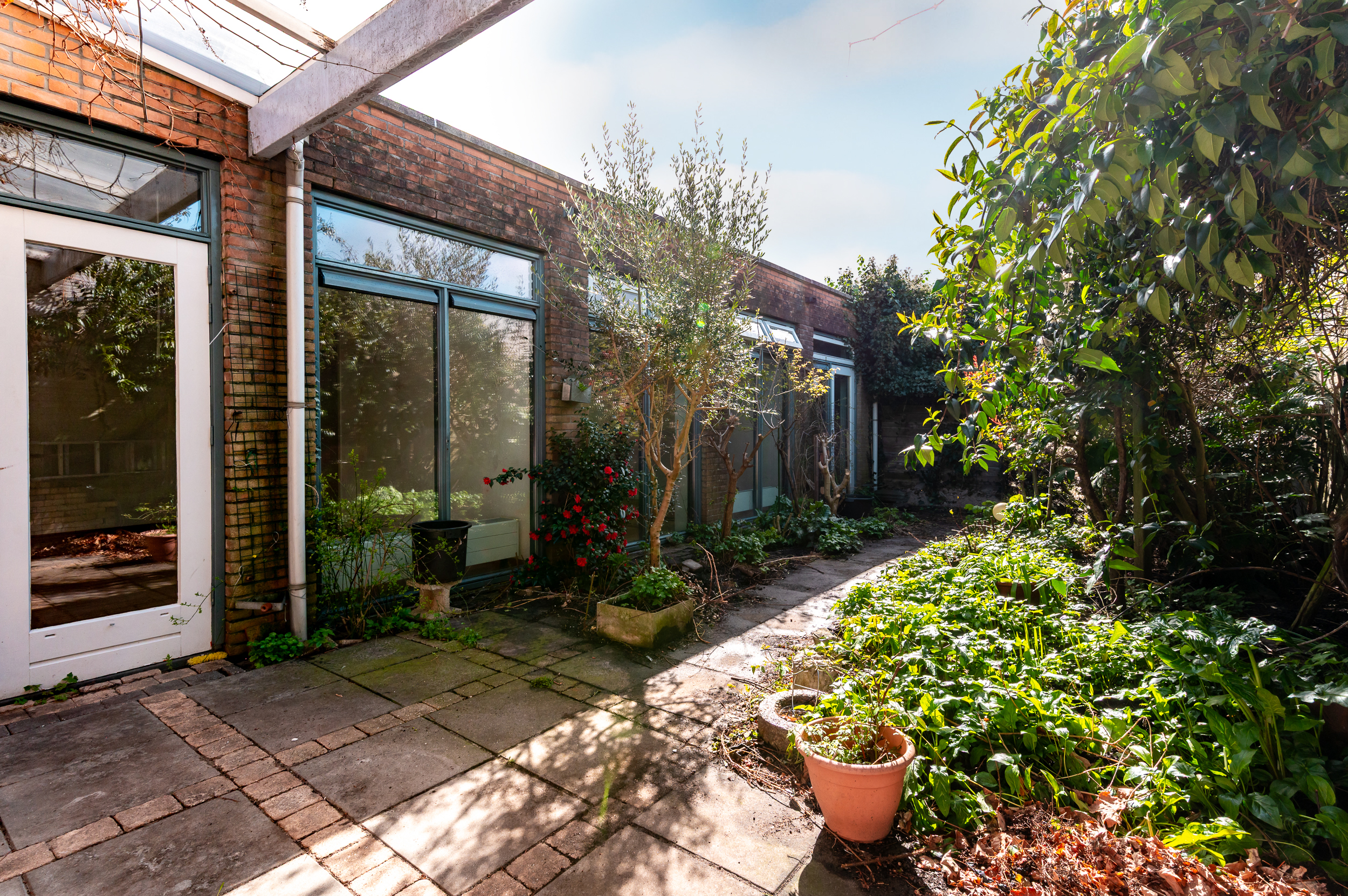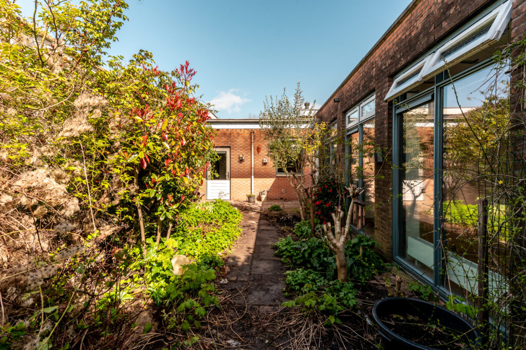 De patiotuin heeft een ligging op het zuiden en is voorzien van bestrating, borders met bomen en beplanting en een overkapping.