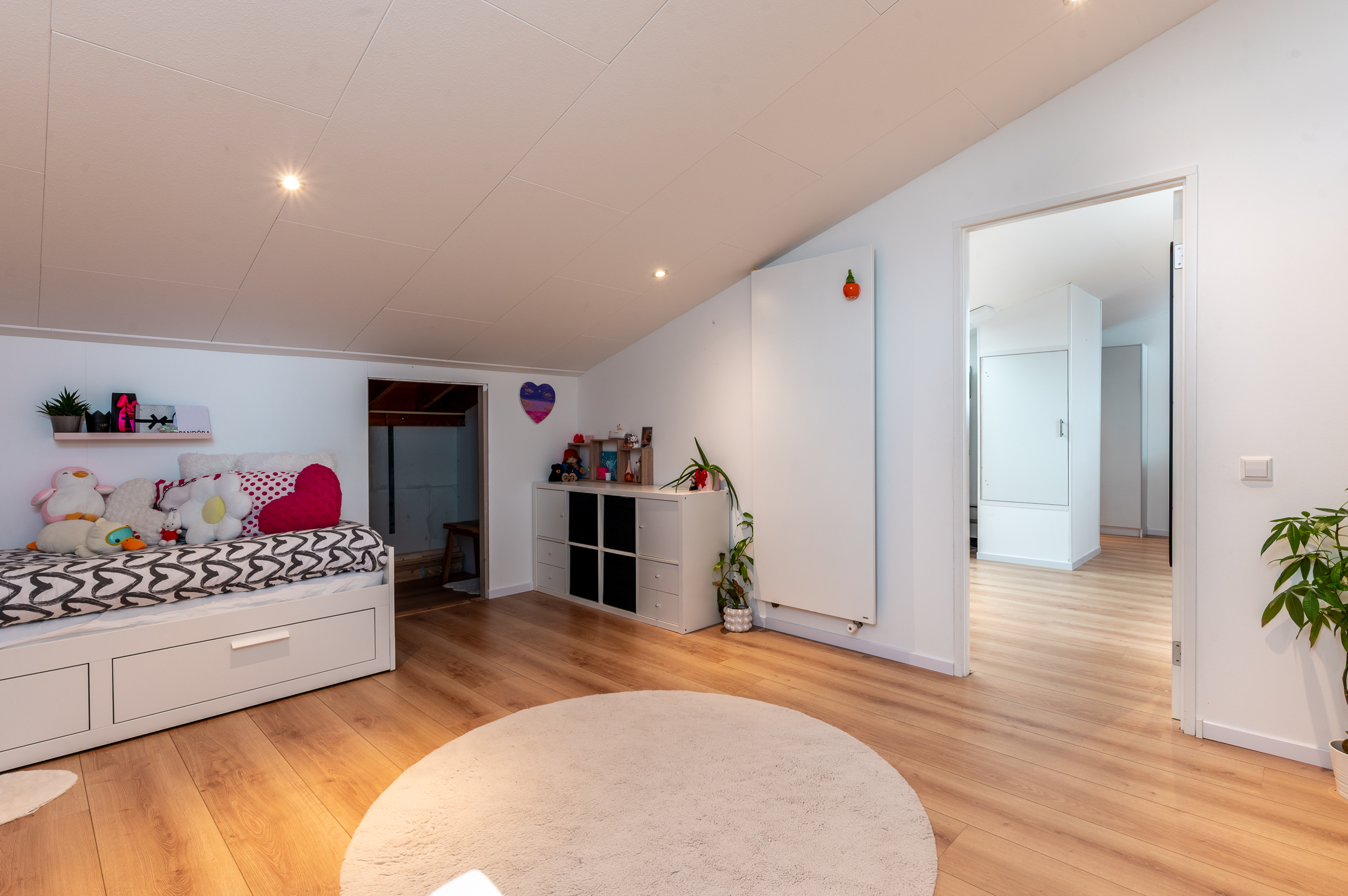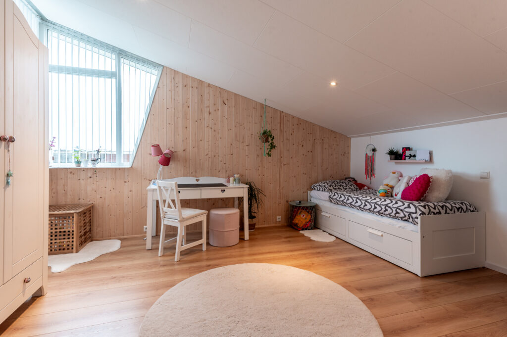 Op de eerste verdieping bevinden zich twee zeer ruime slaapkamers (mogelijkheid voor drie slaapkamers) en een moderne badkamer met een wastafelmeubel, douche, ligbad, mechanische ventilatie en elektrische vloerverwarming. De tweede verdieping beschikt eveneens over twee royale slaapkamers, waardoor deze woning verrassend veel ruimte biedt.