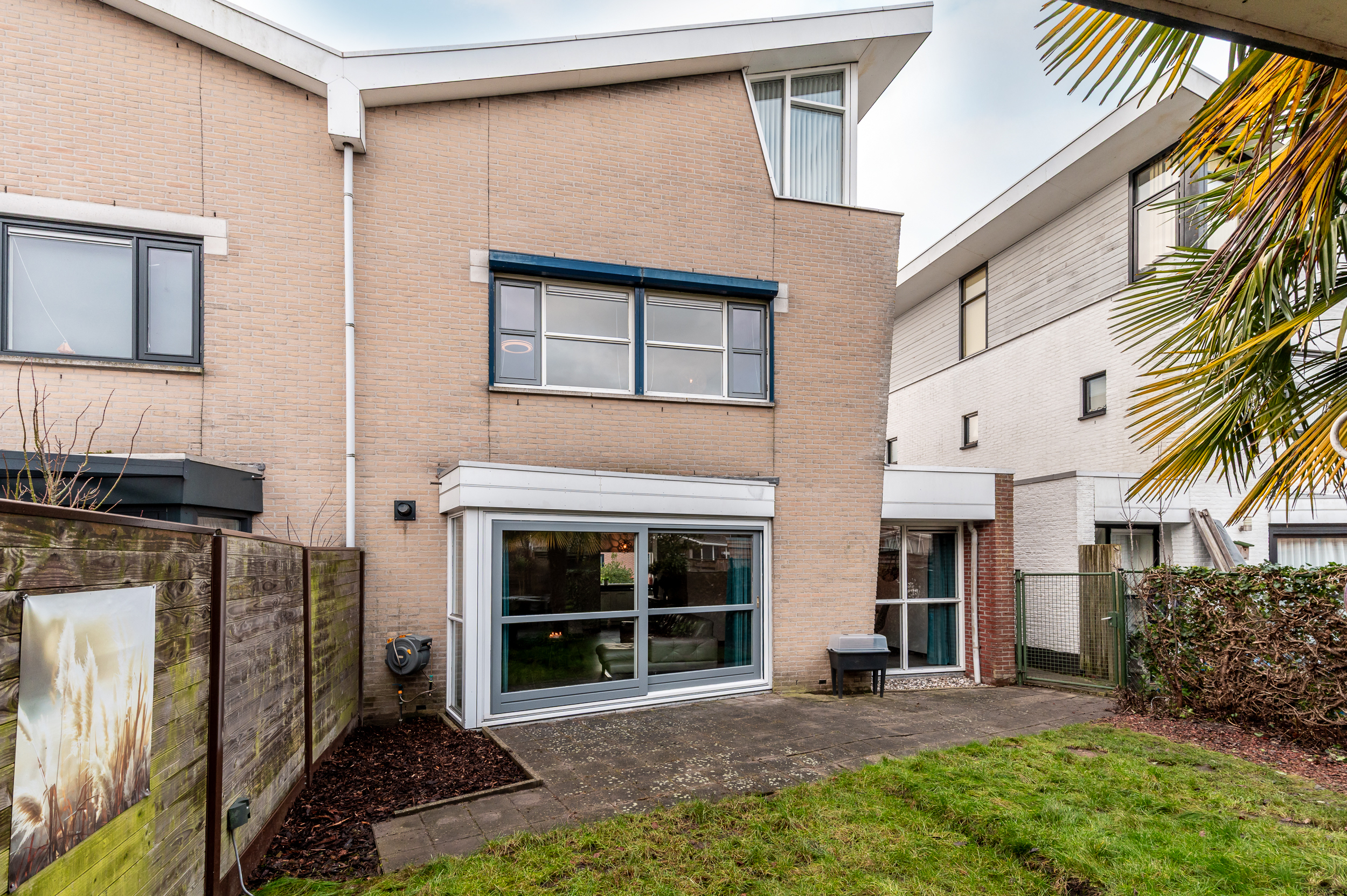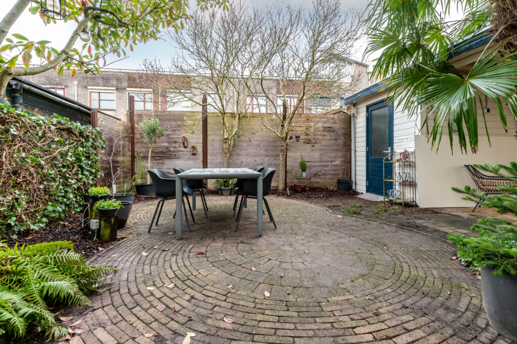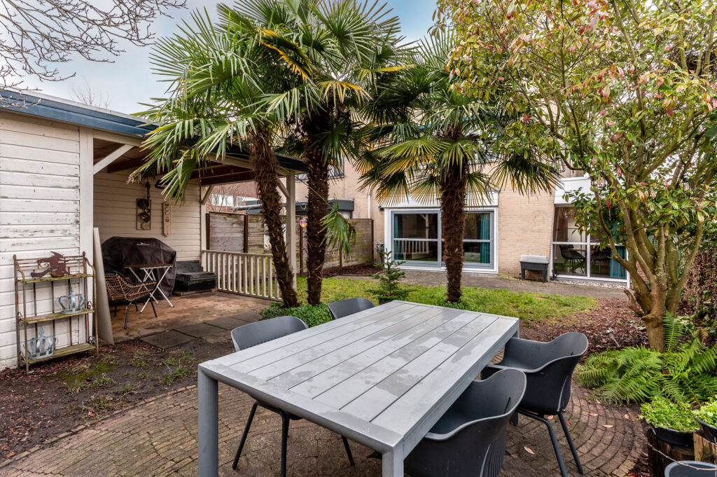 Buiten is het net zo aangenaam. De volledig betegelde voortuin op het zuidwesten geeft de woning een verzorgde uitstraling en op eigen terrein is parkeergelegenheid voor meerdere auto’s. De riante achtertuin, gelegen op het noordoosten, is deels betegeld en deels groen ingericht en biedt volop mogelijkheden om te ontspannen. Achter op het perceel staat een vrijstaande houten berging met overkapping.