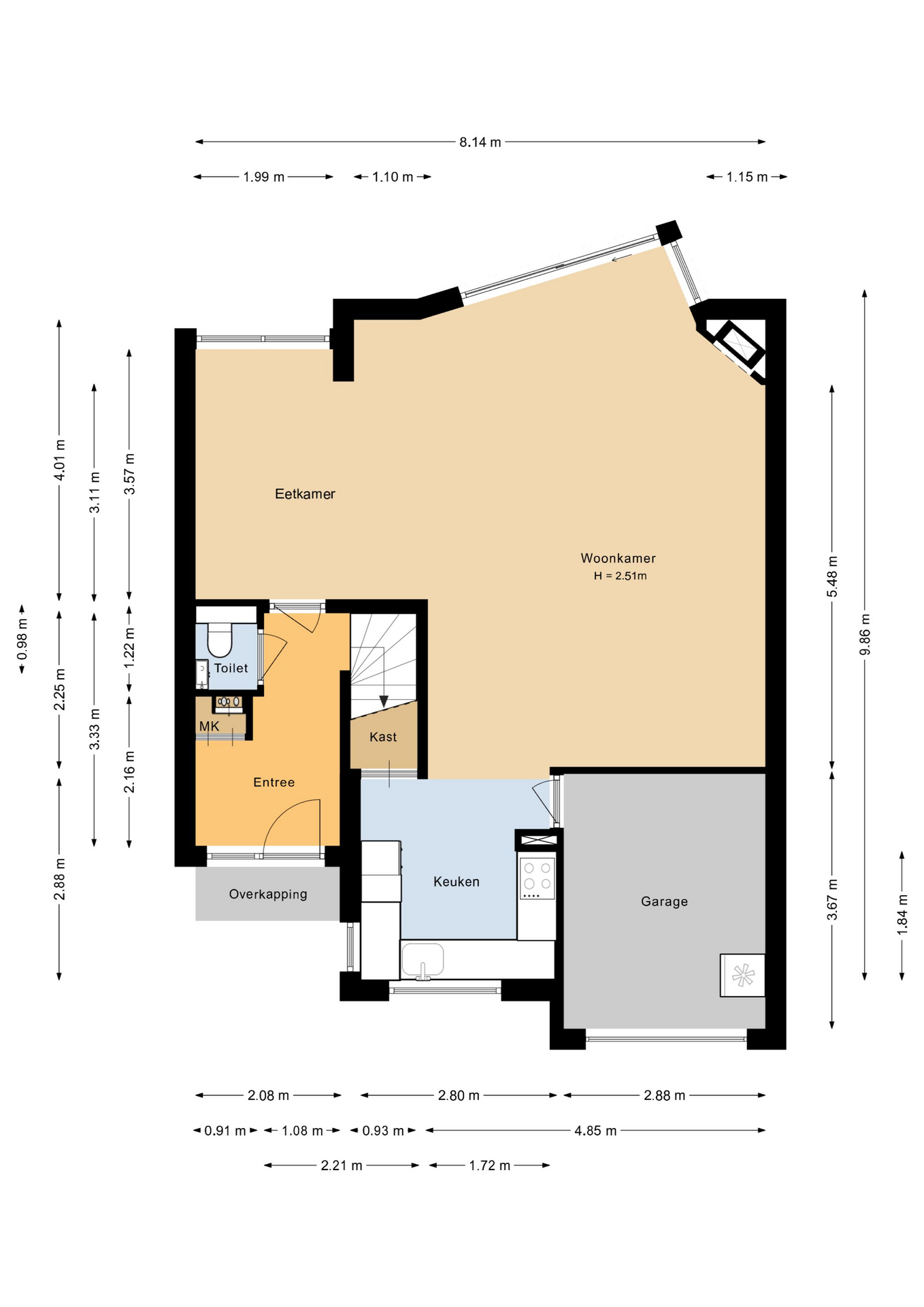 Overdekte entree, hal, modern toilet met fonteintje, zeer royale en lichte woon-/eetkamer (ca. 39 m²) met gashaard en schuifpui naar de tuin, open moderne keuken voorzien van diverse inbouwapparatuur, trapkast, toegang tot de garage (ca. 11 m²).
