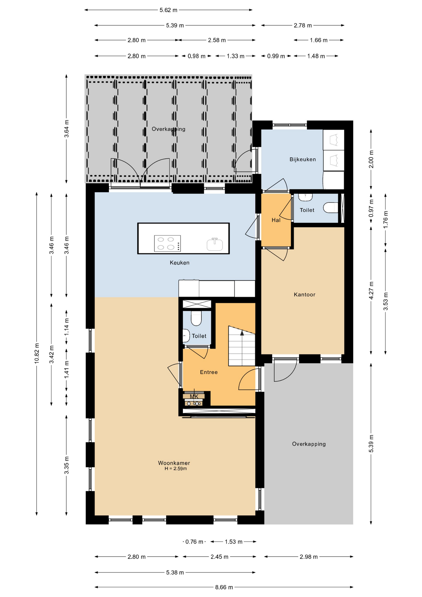 Entree/hal met de meterkast, toiletruimte, trapopgang naar de verdieping en toegang tot de woonkamer. Een heerlijke en ruime woonkamer met grote raampartijen (veel lichtinval!), een sfeervolle haard, glad gestuukte wanden, plafond met luxe (dim to warm) spots en een fraaie tegelvloer met vloerverwarming. Aan de achterzijde bevindt zich de luxe woonkeuken met openslaande deuren naar de serre en de tuin, welke voorzien is van de volgende apparatuur; een koelkast, vriezer, vaatwasser, stoomoven (Kupperbusch), oven (Kupperbusch), Quooker (verguld goud) en een 4-pits Bora inductiekookplaat met geïntegreerde afzuigkap. Tussenhal met een 2e toilet en toegang tot de praktijkruimte, welke momenteel is ingericht als kapsalon met een fraaie PVC-vloer, airco (warmte/koelen) en een eigen entree. Bijkeuken met de wasmachine/drogeropstelling, een koel/vriescombinatie (ter overname) en een deur naar de tuin/serre. De praktijkruimte en de bijkeuken kunnen eventueel eenvoudig worden aangepast naar een slaapkamer en badkamer, waardoor gelijkvloers wonen tot de mogelijkheden behoort! In 2024 is de woning uitgebreid met een schitterende aangebouwde serre, voorzien van een sfeervolle design houthaard (Hase), glazen schuifwanden (met rookglas) en schuifpanelen met houtlook aluminium jaloezieën, zodat u zelf de gewenste privacy en/of lichtinval kunt bepalen.
