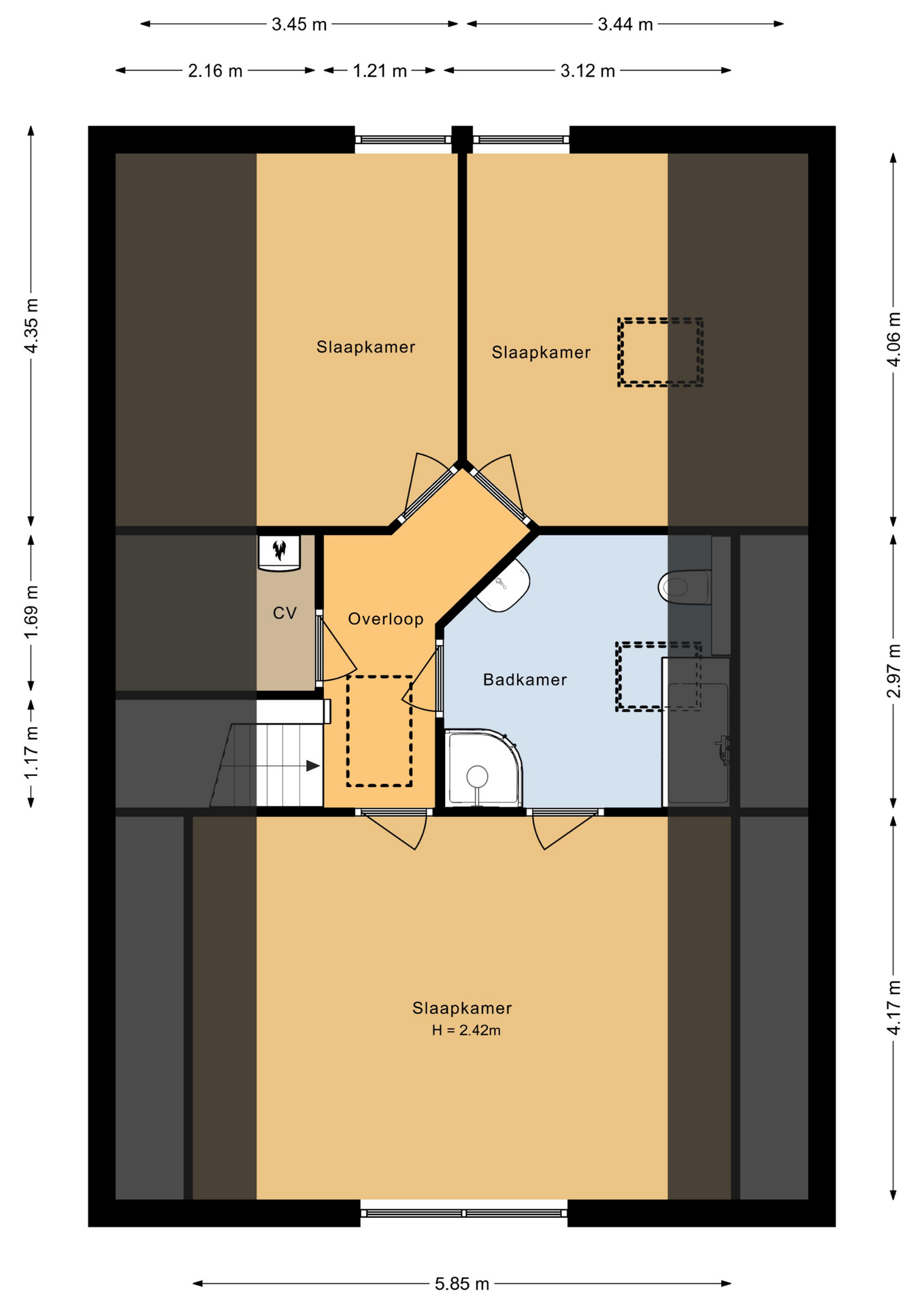 Overloop met vide en toegang tot 3 ruime slaapkamers (ca. 22 / 11 / 11 m2), waarvan de ouderslaapkamer over de volle breedte van de woning. Keurige badkamer met een ligbad, douche, 2e toilet, wastafelmeubel, designradiator en een raam voor de natuurlijke ventilatie. Technische ruimte met de opstelplaats van de cv-ketel (2018 / huur) en veel praktische bergruimte. De verdieping is voorzien van een laminaatvloer.