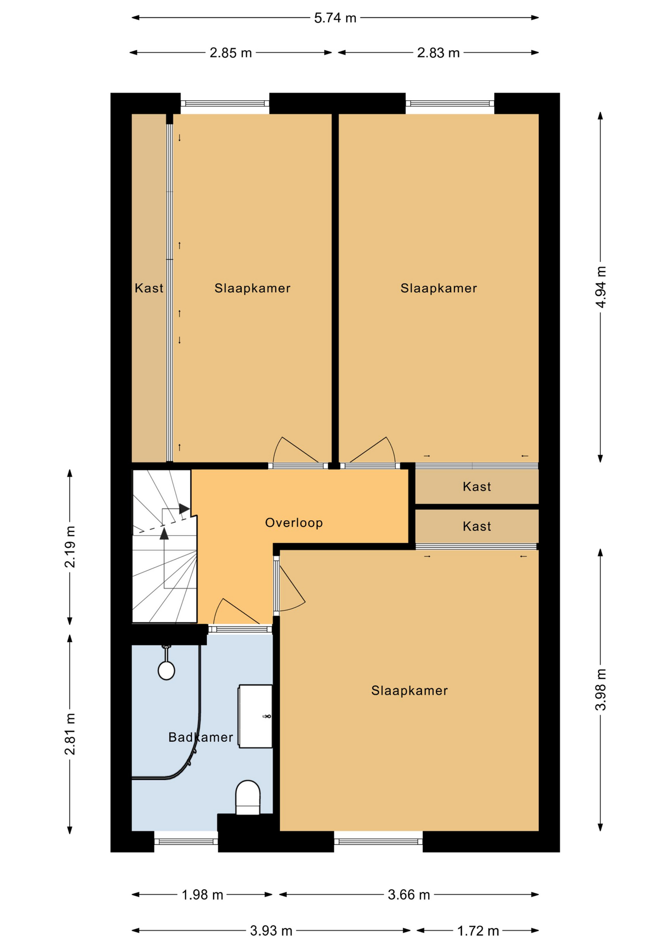 Overloop met toegang tot 3 ruime slaapkamers (ca. 15 / 15 / 14 m2), allen voorzien van inbouwkasten. Moderne badkamer (2012) met een inloopdouche, 2e toilet, wastafelmeubel, radiator en een raam voor de natuurlijke ventilatie. De verdieping is voorzien van een laminaatvloer.