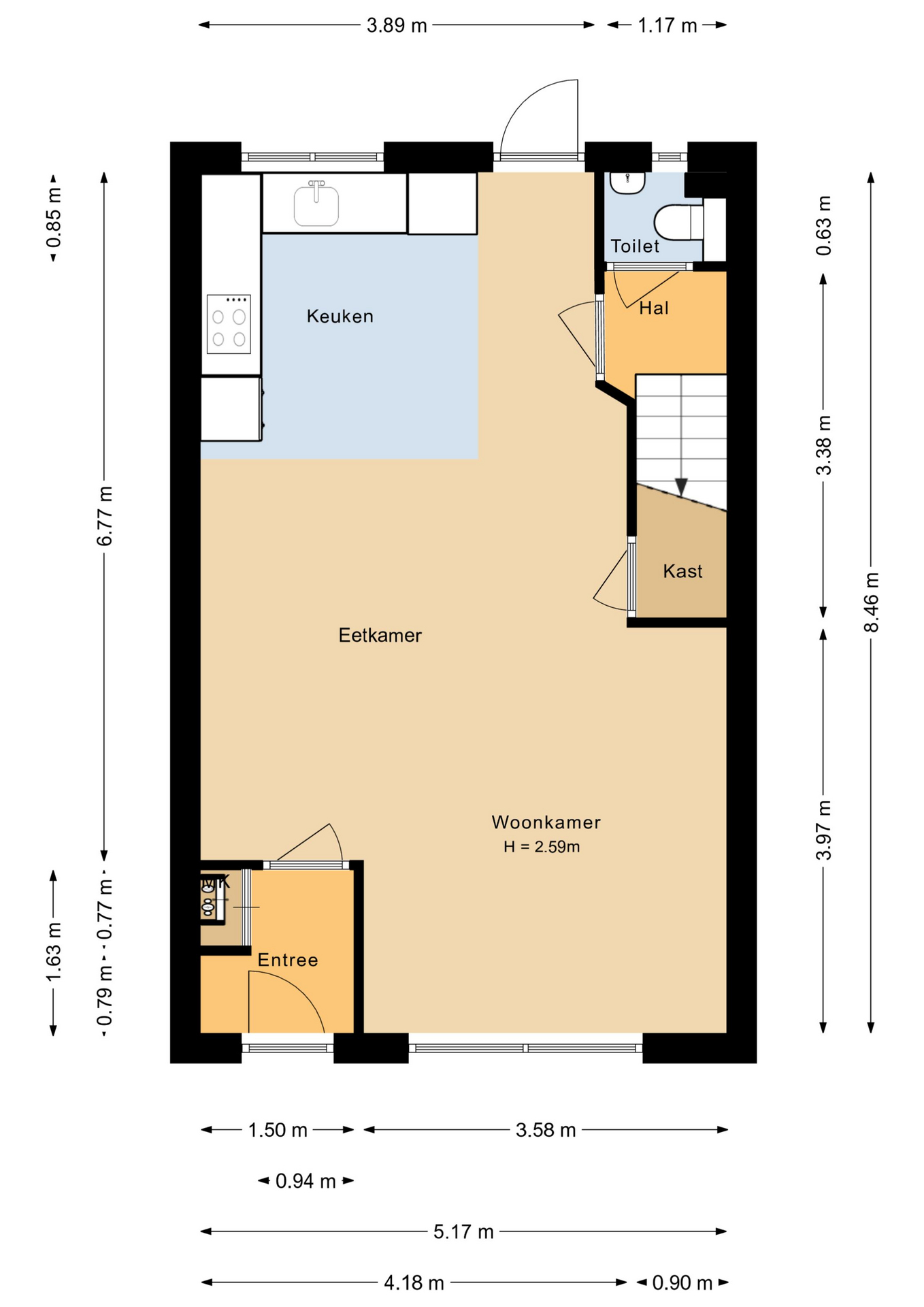 Entree/hal met de garderobe, meterkast (2019) en toegang naar de woonkamer. Een heerlijke straatgerichte woonkamer met grote raampartijen (veel lichtinval) en een praktische trapkast. Aan de achterzijde bevindt zich de moderne inbouwkeuken (2020) in L-opstelling, welke voorzien is van de volgende apparatuur; koelkast, vriezer, vaatwasser, oven, magnetron, 4-pits inductiekookplaat en een afzuigkap. Ruime opstelmogelijkheden voor een grote eettafel waar u heerlijk met uw vrienden en familie kunt dineren. Tussenhal met de toiletruimte (2020) en de trapopgang naar de verdieping. De begane grond is voorzien van een laminaatvloer.