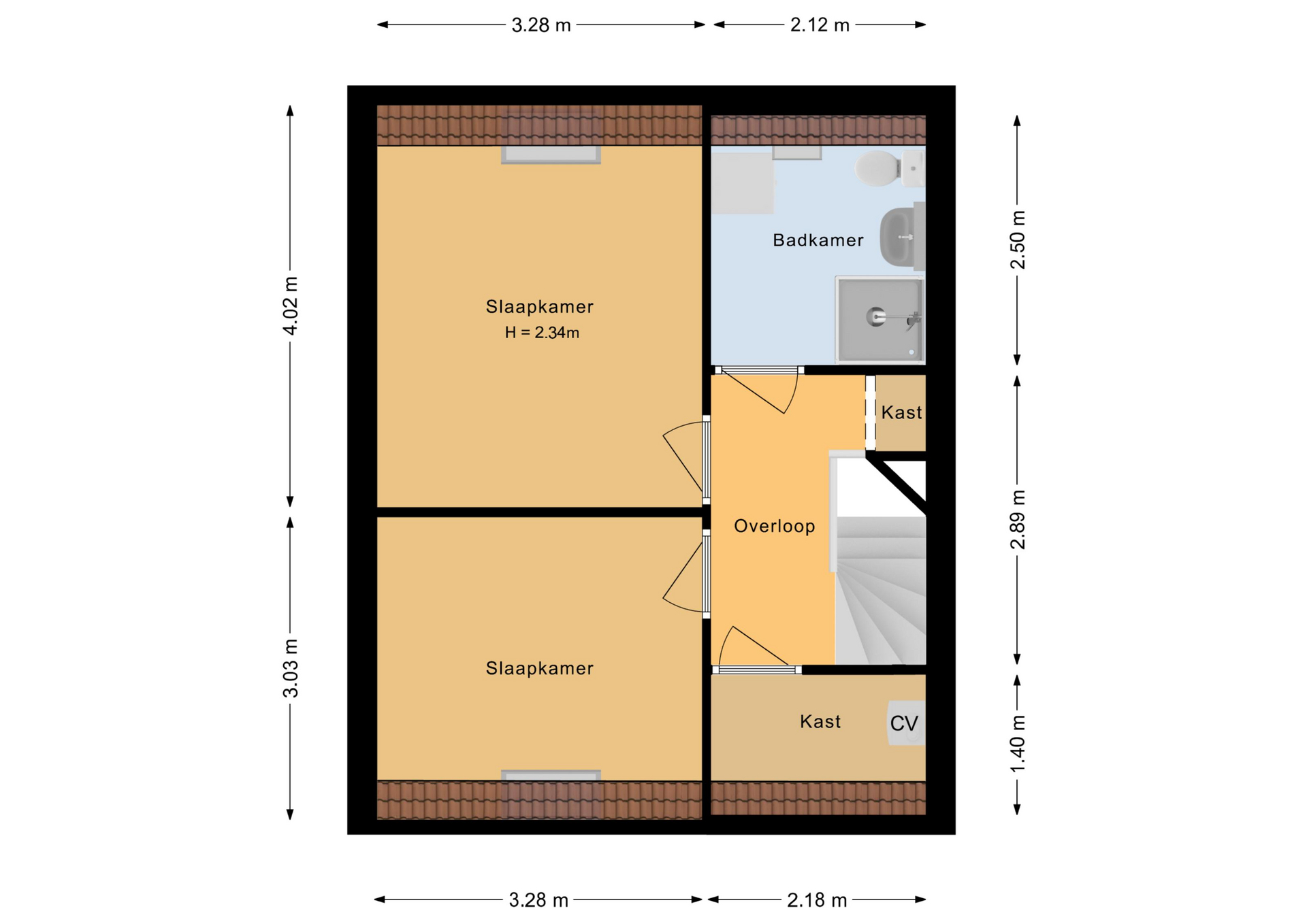 Eerste verdieping: Overloop met toegang tot een separate ruimte met extra bergruimte, de cv-ketel (2004) en de zonneboiler; twee slaapkamers (ca. 9 en 12m²); volledig betegelde badkamer van ca. 5m² welke is voorzien van een separate douchehoek, tweede toilet, een wastafel, de wasmachine- en droger aansluiting en een dakraam voor daglichttoetreding en ventilatie.