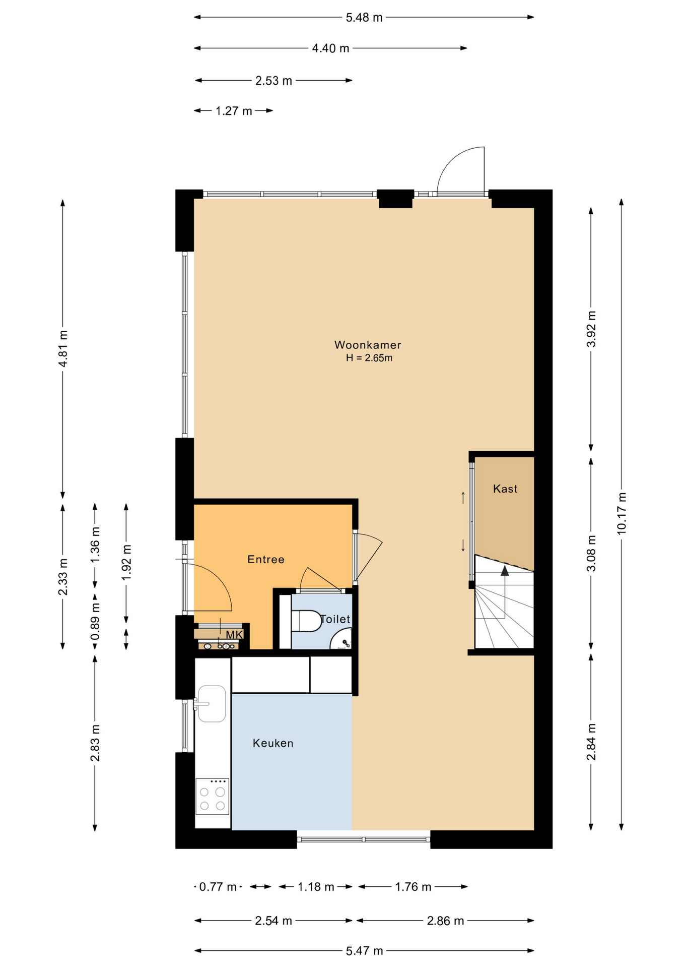 Entree/hal met de meterkast, toiletruimte (2022), garderobe en toegang naar de woonkamer. Een heerlijke ruime woonkamer van 5.48 m. breed met grote raampartijen (veel lichtinval), een fraaie tegelvloer met vloerverwarming en een deur naar de tuin. Aan de voorzijde bevindt zich de nette inbouwkeuken (2017), welke voorzien is van de volgende apparatuur; koelkast, vriezer, vaatwasser, combimagnetron, Quooker, 4-pits inductiekookplaat en een afzuigkap. Ruime opstelmogelijkheden voor een grote eettafel waar u heerlijk met uw familie kunt dineren. Trapopgang naar de verdieping en voldoende bergruimte in de trapkast, welke fraai is weggewerkt middels 2 sfeervolle loftdeuren.