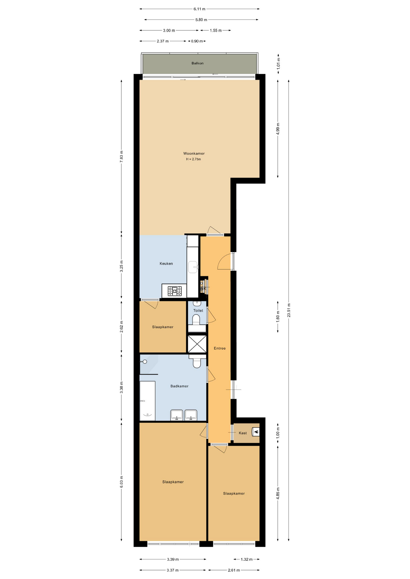 Entree/hal met de meterkast, garderobe, toiletruimte, bergkast met opstelplaats van de cv-ketel (2019), de mechanische ventilatie box en toegang tot diverse vertrekken. Heerlijke lichte en ruime woonkamer (6,11 m. breed) met grote raampartijen en middels een dubbele aluminium schuifpui toegang naar het zonnige balkon met vrij uitzicht en ligging op het zuiden! Nette inbouwkeuken in hoekopstelling, welke voorzien is van de volgende apparatuur: koelkast (met vriesvak), vaatwasser, oven, 5-pits gaskookplaat en een afzuigkap. Aangrenzend treft u de praktische bijkeuken met aansluiting voor een wasmachine en/of droger. Aan de achterzijde van het appartement treft u 2 riante slaapkamers (ca. 20 m2 en 13 m2). Moderne, geheel betegelde badkamer met een ligbad, (inloop)douche, 2e toilet, dubbele wastafel en een designradiator. Het appartement is voorzien van een laminaatvloer.