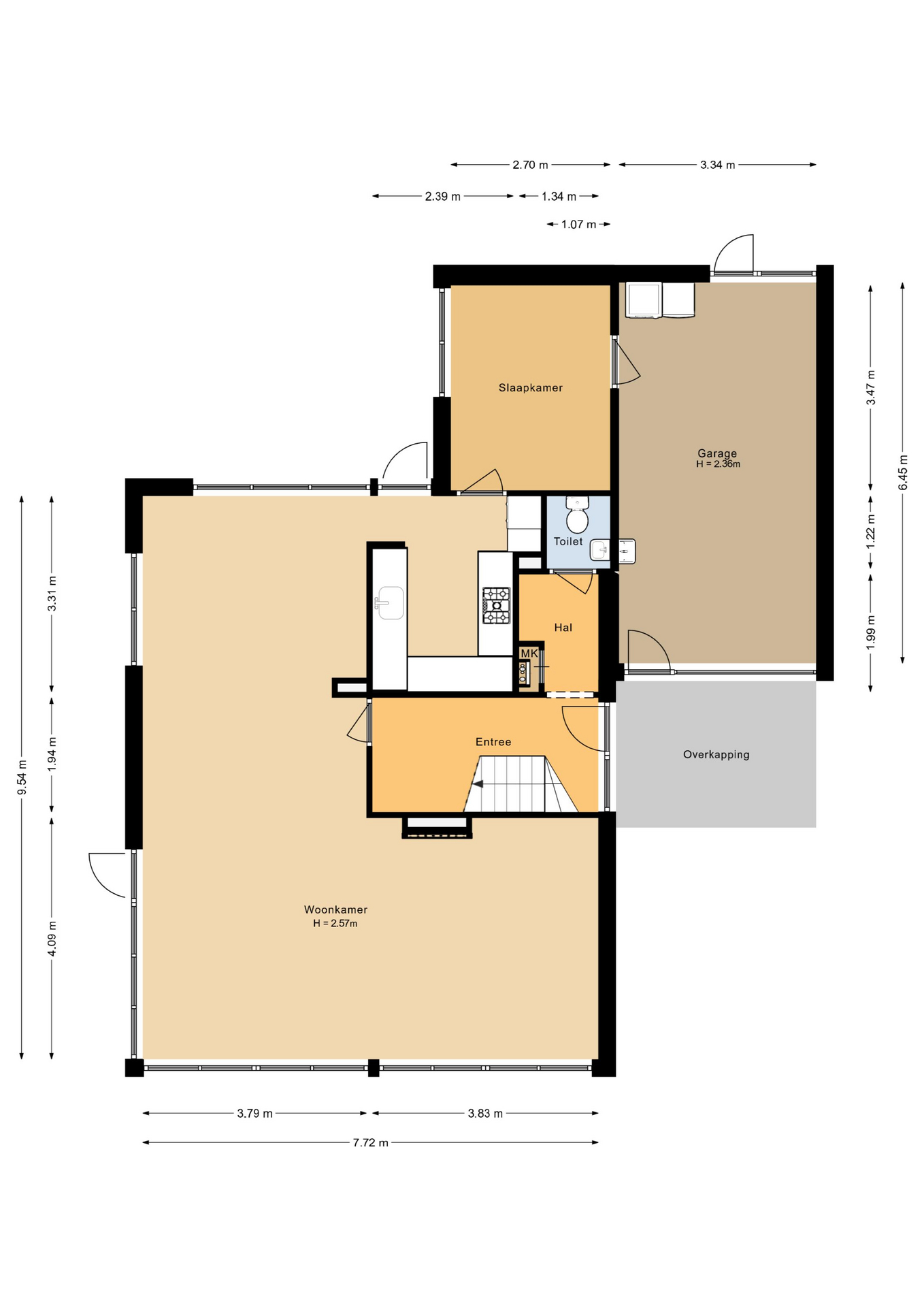 Entree/hal met de meterkast (2016), toiletruimte, garderobe, trapopgang naar de verdieping en toegang naar de woonkamer. Ruimte straatgerichte woonkamer (7.72 m. breed) met een sfeervolle gashaard (Faber), grote raampartijen (met veel lichtinval) en middels een deur toegang naar het terras. Aan de achterzijde bevindt zicht de fraaie inbouwkeuken (2001) in U-opstelling met bar, welke voorzien is van de volgende apparatuur; koelkast (2020), vaatwasser, oven, 5-pits gaskookplaat (2018) en een afzuigkap. Ruime opstelmogelijkheden voor een grote eettafel waar u heerlijk met uw familie kunt dineren. Aangrenzend een praktische werkruimte met een kunststof pui (2014) met zicht op de tuin. Deze ruimte kan ook eenvoudig worden omgebouwd tot slaapkamer, waardoor gelijkvloers wonen tot de mogelijkheden behoort! Aangrenzend treft u de riante garage (ca. 22 m2) met een loop- en kanteldeur aan de voorzijde, een wastafel, radiator, de wasmachine/droger opstelling, een vriezer en een deur naar de tuin. De begane grond is deels voorzien van vloerbedekking en deels van plavuizen (m.u.v. de garage).