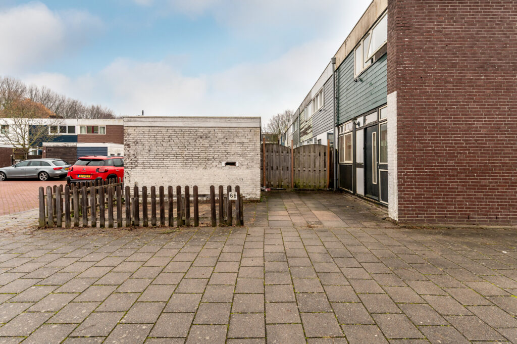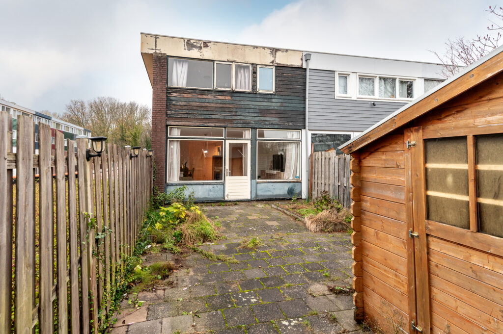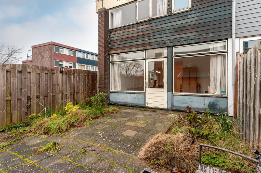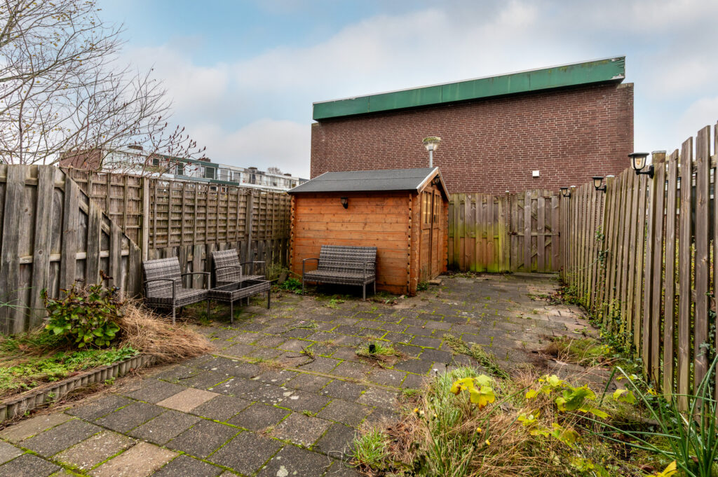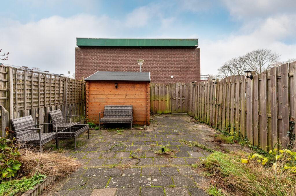 De zonnige achtertuin (9x5 meter) is volledig betegeld. Achterop het perceel staat nog een vrijstaande houten berging (ca. 6 m²) en poort naar de zijkant.