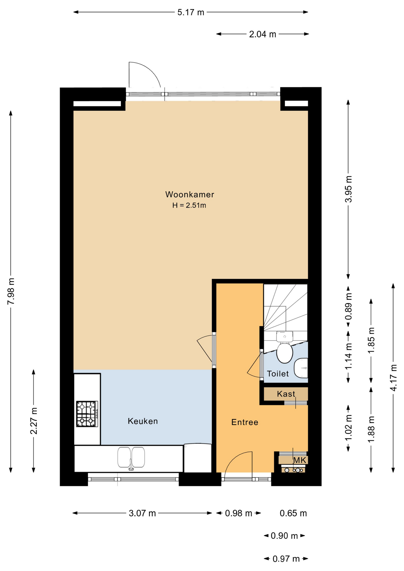 Entree, hal, toilet met fonteintje, ruime en lichte woonkamer (ca. 25 m²) met deur naar de achtertuin, open keuken voorzien van inbouw-vaatwasser.