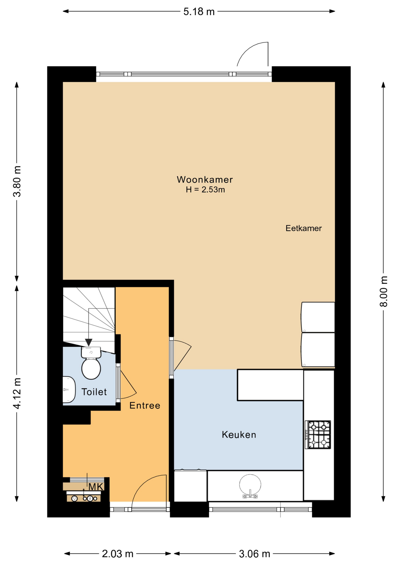 Entree, hal, toilet met fonteintje, ruime woonkamer (ca. 25 m²) met deur naar de achtertuin, straatgerichte open keuken in een U-opstelling.