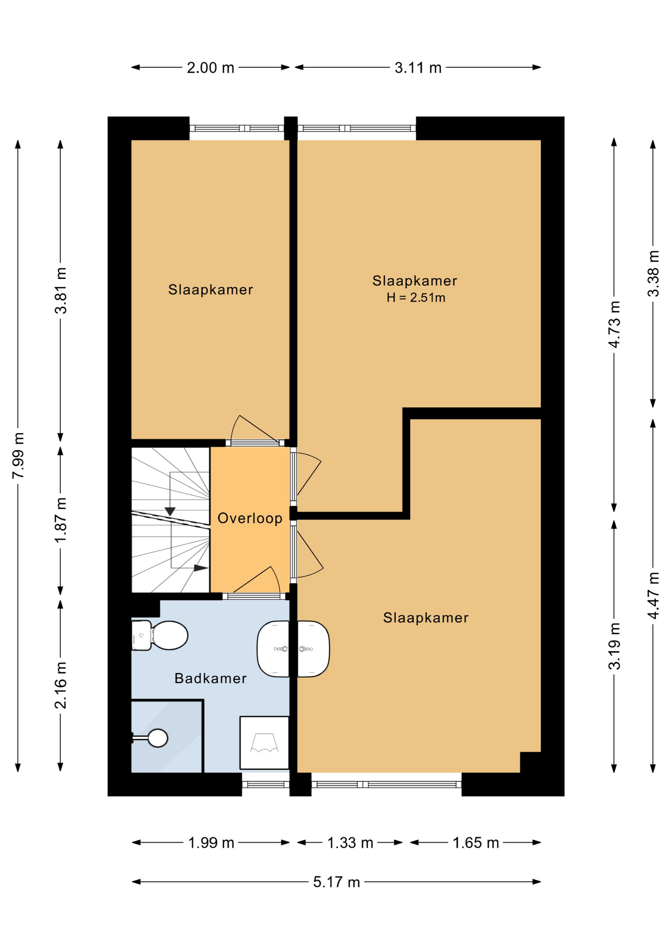 Overloop, ruime eerste slaapkamer (ca. 14 m²) met wastafel, tweede slaapkamer (ca. 8 m²), derde slaapkamer (ca. 11 m²), badkamer voorzien van douchecabine, toilet en wastafel.